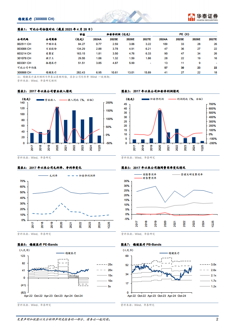 考虑到公司消费品及医疗业务增长提速,华泰研究上调了稳健医疗2025-2026年的收入预测,并新增了2027年盈利预测。预计公司2025-2027年归母净利润分别为10.61亿元、13.01亿元和15.89亿元,其中2025-2026年的预测值较前值分别上调了5.5%和9.7%。对应每股收益(EPS)分别为1.82元、2.23元和2.73元。参考可比公司2025年30倍PE的Wind一致预期均值,并考虑到稳健医疗“消费+医疗”双轮驱动的独特优势和构筑的品牌护城河,分析师给予公司2025年33倍目标PE,将目标价从前值的51.90元上调至60.06元,并维持“买入”评级。