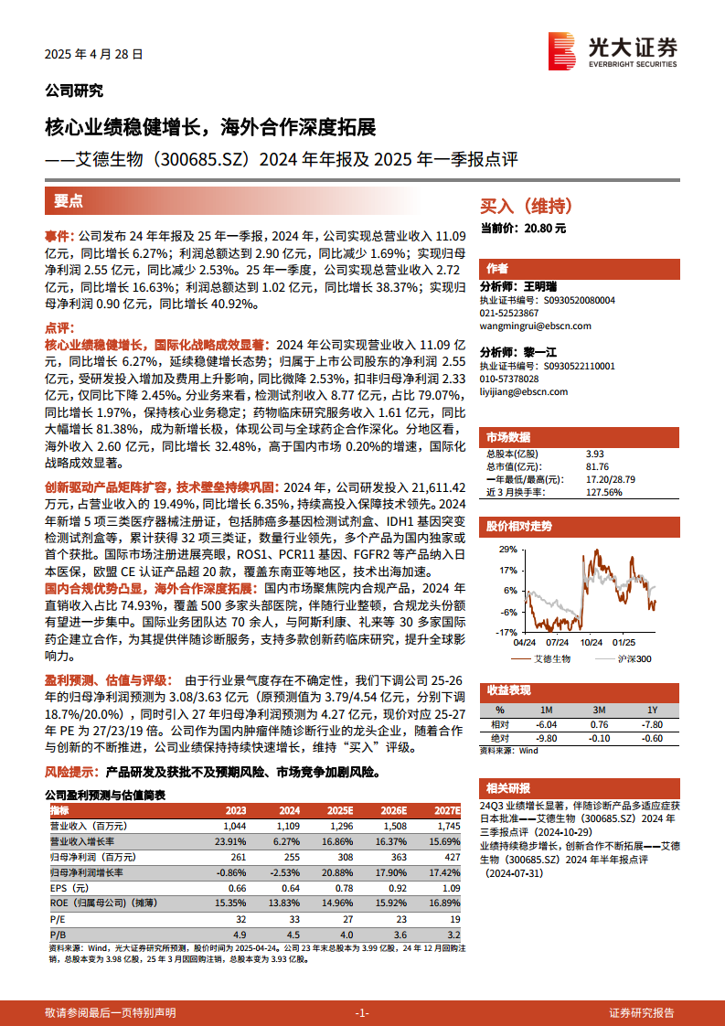 艾德生物(300685):2024年年报及2025年一季报点评:核心业绩稳健增长,海外合作深度拓展
