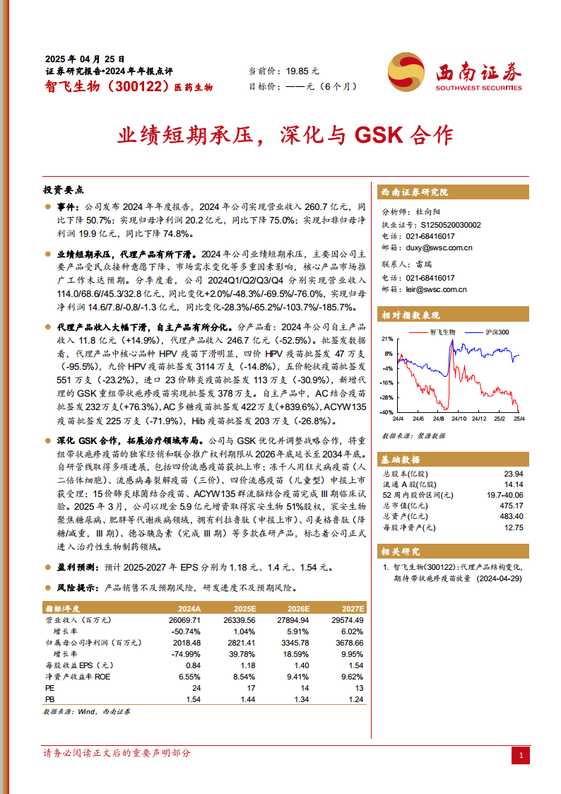 2024年对智飞生物而言是充满挑战的一年,公司业绩因核心代理产品市场需求变化而承受巨大压力,营收和净利润均出现大幅下滑,并呈现出季度性加速恶化的趋势。然而,公司并未止步于此,而是积极采取战略性应对措施。通过深化与GSK在重组带状疱疹疫苗上的合作,延长独家经销期限,为公司未来收入提供了更稳定的预期。同时,公司在自主研发方面持续投入并取得显著进展,多款疫苗产品进入上市或临床后期阶段,预示着自主产品线将成为未来业绩增长的重要驱动力。