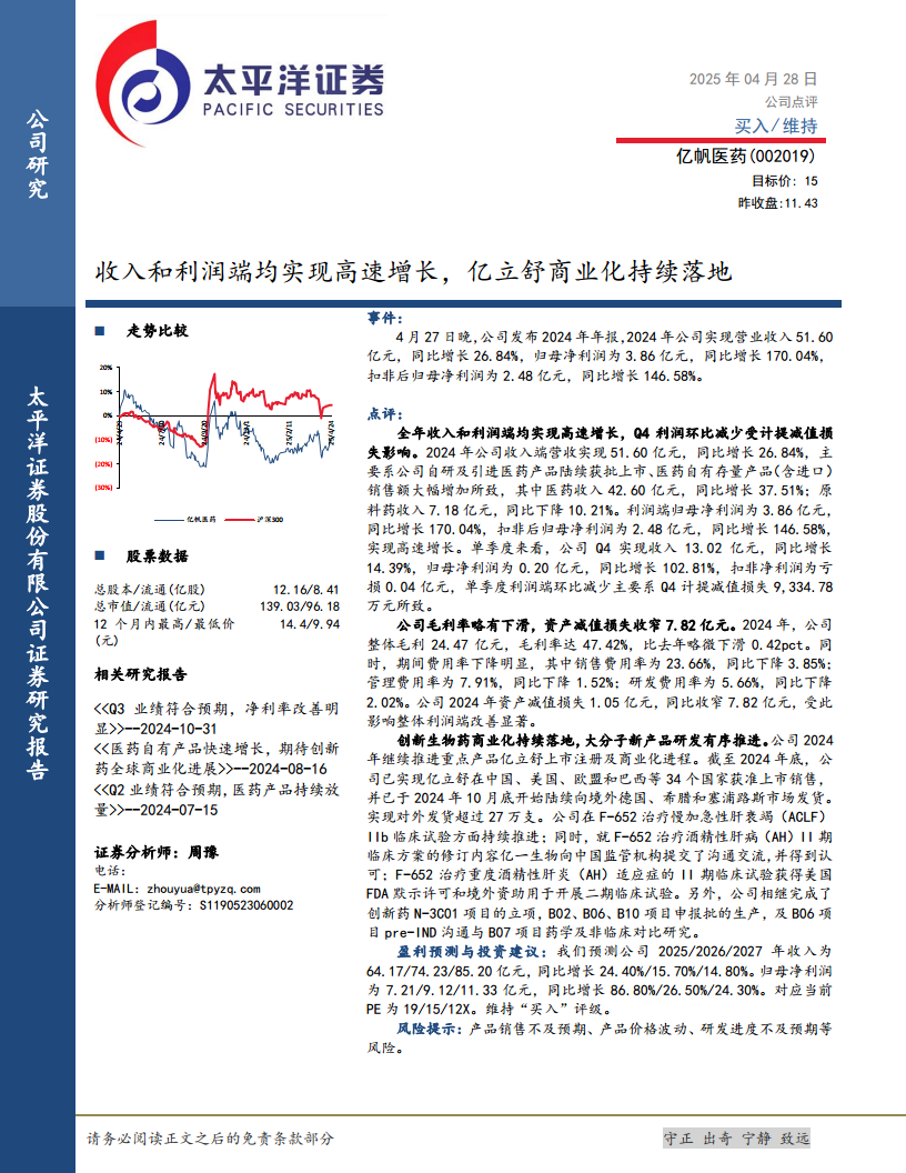 基于公司2024年强劲的业绩表现和持续的创新药进展,分析师对亿帆医药的未来业绩持乐观态度,并给出了积极的盈利预测。