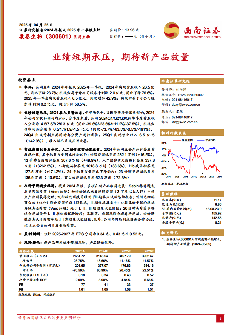 康泰生物在2024年经历了业绩的短期承压,主要受市场竞争和渠道去库存影响,并因资产减值导致第四季度亏损。然而,2025年第一季度收入的显著改善,以及人二倍体狂犬疫苗等核心产品批签发量的快速增长,表明公司已展现出业绩复苏的积极态势。公司在研管线稳步推进,多款疫苗进入关键临床阶段或获得生产注册受理,与阿斯利康的战略合作也为未来创新发展注入动力。尽管面临新产品研发不及预期和产品降价的风险,但基于对二类疫苗销量恢复、一类疫苗新品上市以及其他业务增长的乐观假设,分析师预计公司未来三年盈利能力将显著提升,每股收益和净资产收益率均有望持续增长,估值也将逐步回归合理区间。