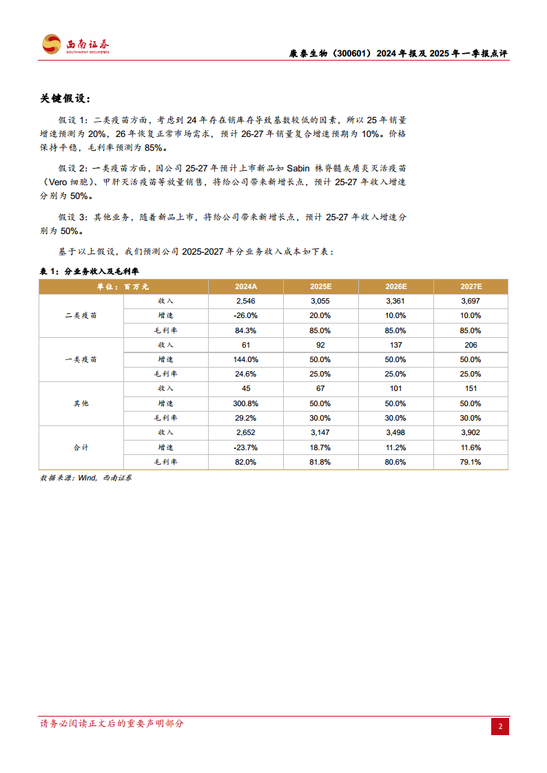 西南证券预计康泰生物2025-2027年的每股收益(EPS)分别为0.34元、0.43元和0.52元。这一预测基于以下关键假设: