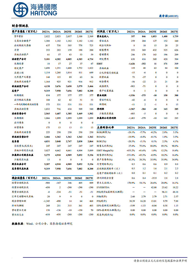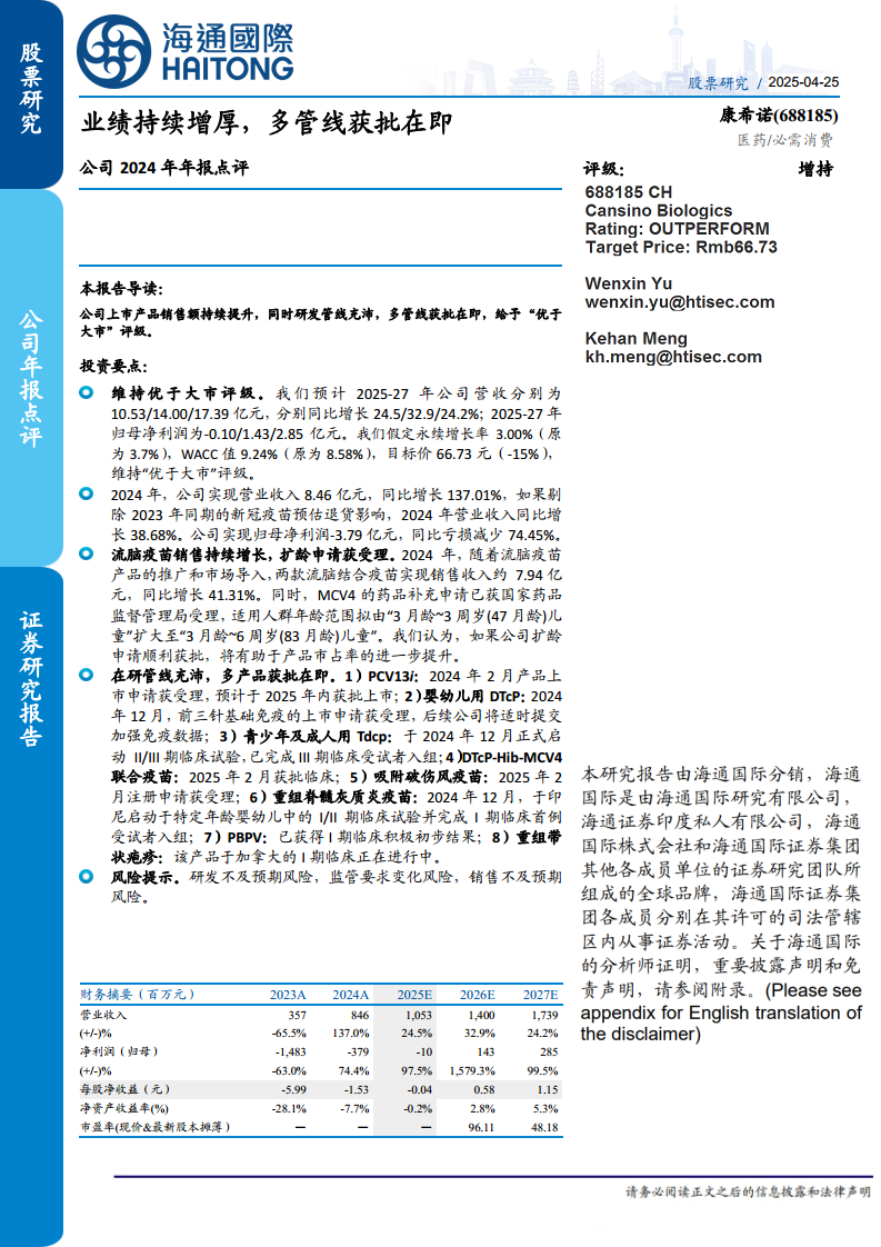 本报告的核心观点在于康希诺(688185)凭借其上市产品销售额的持续增长和丰富多元的研发管线,展现出强劲的业绩增厚潜力。尽管2024年公司仍处于亏损状态,但亏损幅度显著收窄,且流脑疫苗销售表现亮眼。分析师维持对康希诺的“优于大市”评级,并设定目标价格为66.73元,反映了市场对其未来增长的积极预期。