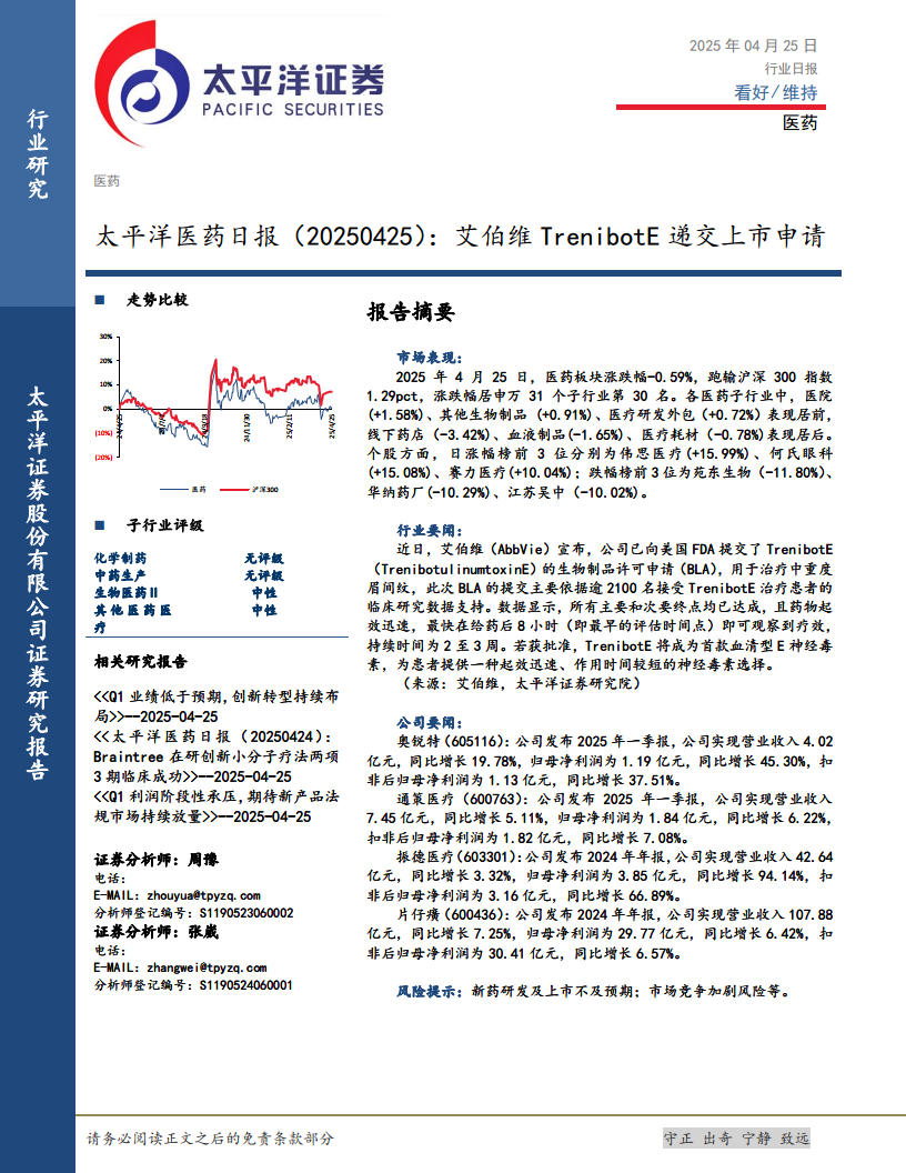 本报告对2025年4月25日医药行业的市场表现进行了全面分析,揭示了当日医药板块整体跑输大盘的趋势,并详细列出了各子行业及个股的具体涨跌幅数据。同时,报告聚焦行业前沿,重点介绍了艾伯维(AbbVie)一款创新神经毒素药物TrenibotE的上市申请进展,预示着未来市场可能出现新的治疗选择。