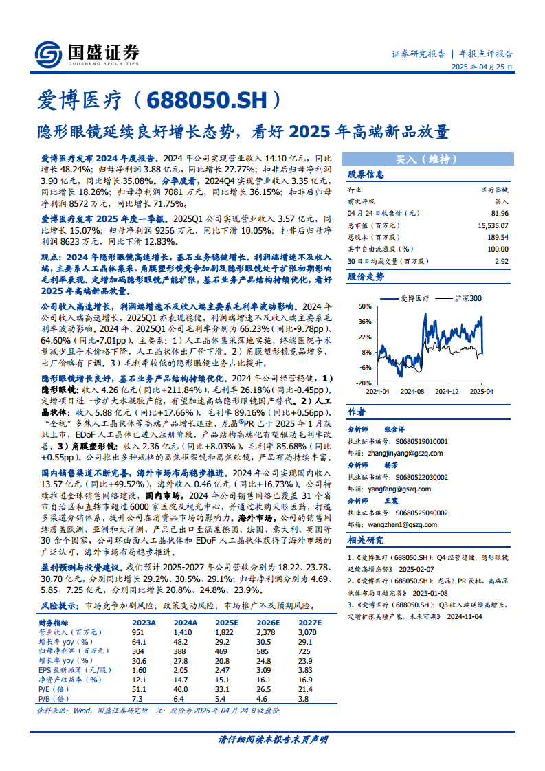 爱博医疗(688050):隐形眼镜延续良好增长态势,看好2025年高端新品放量