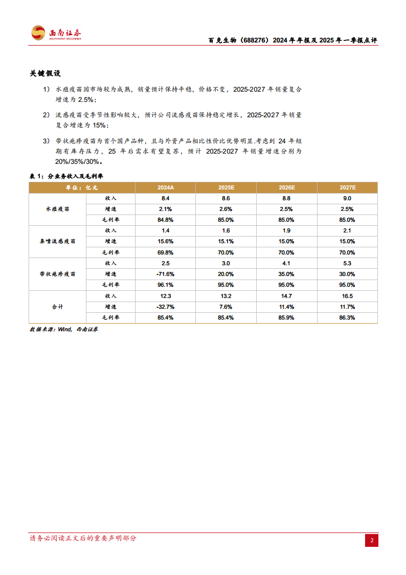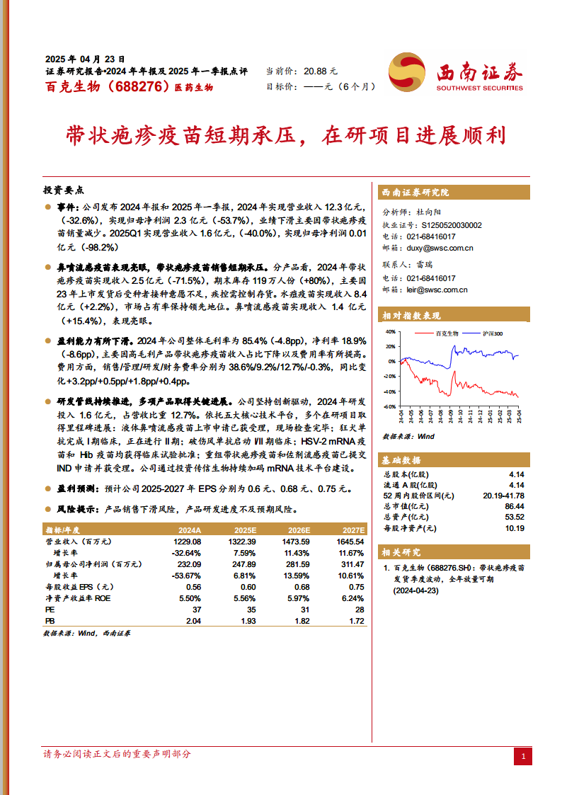 百克生物在2024年及2025年第一季度面临带状疱疹疫苗销售承压导致的业绩下滑和盈利能力下降。然而,公司在水痘疫苗市场保持稳定,鼻喷流感疫苗表现突出,显示出其在疫苗市场的多元化布局。更重要的是,公司持续高强度投入研发,多个创新疫苗项目取得实质性进展,特别是液体鼻喷流感疫苗的上市申请受理和mRNA技术平台的加码,为公司未来业绩增长和市场竞争力的提升提供了长期驱动力。尽管短期内存在产品销售下滑和研发进度不确定性等风险,但其丰富的研发管线和创新战略有望支撑公司在中长期实现复苏和增长。