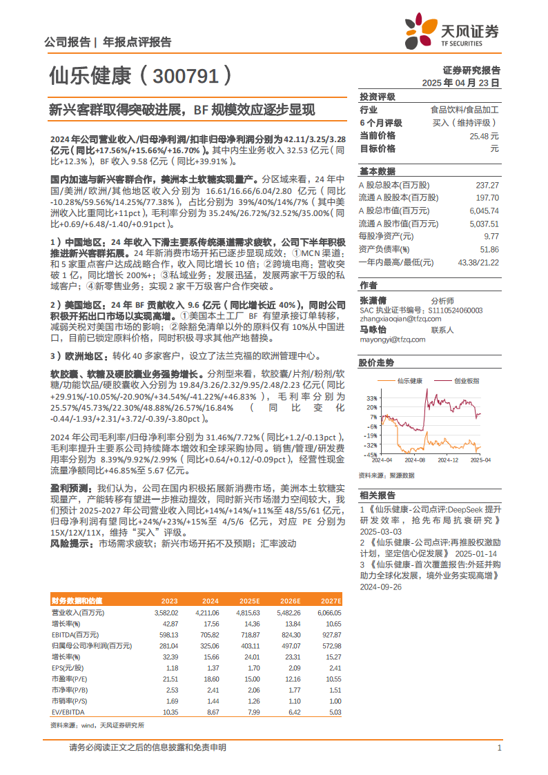 仙乐健康在2024年展现出强劲的增长韧性,营业收入和归母净利润均实现双位数增长。公司成功应对中国传统渠道挑战,通过新兴客群拓展实现业务突破;美洲市场BF业务表现亮眼,本土化生产策略有效规避风险并提升效率。软胶囊、软糖和硬胶囊等核心剂型业务强势增长,带动整体盈利能力优化。展望未来,公司在国内新消费市场的积极布局、美洲本土产能的释放以及新兴市场的巨大潜力,将持续推动业绩增长。预计2025-2027年公司营收和归母净利润将保持稳健增长,维持“买入”评级。投资者需关注市场需求疲软、新兴市场开拓不及预期及汇率波动等潜在风险。