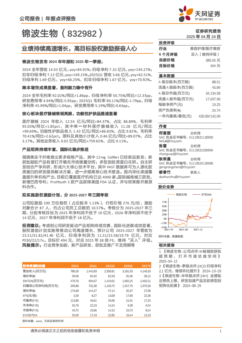 锦波生物在2024年及2025年第一季度展现出卓越的财务表现,营收和净利润均实现高速增长,盈利能力显著提升。这主要得益于其核心医疗器械业务的强劲增长以及功能性护肤品的快速发展。公司通过持续的产品创新、深化国内外市场布局以及实施高目标的股权激励计划,为未来的可持续增长奠定了坚实基础。分析师对公司未来业绩持乐观态度,预计其将继续保持高速增长,并维持“买入”评级。