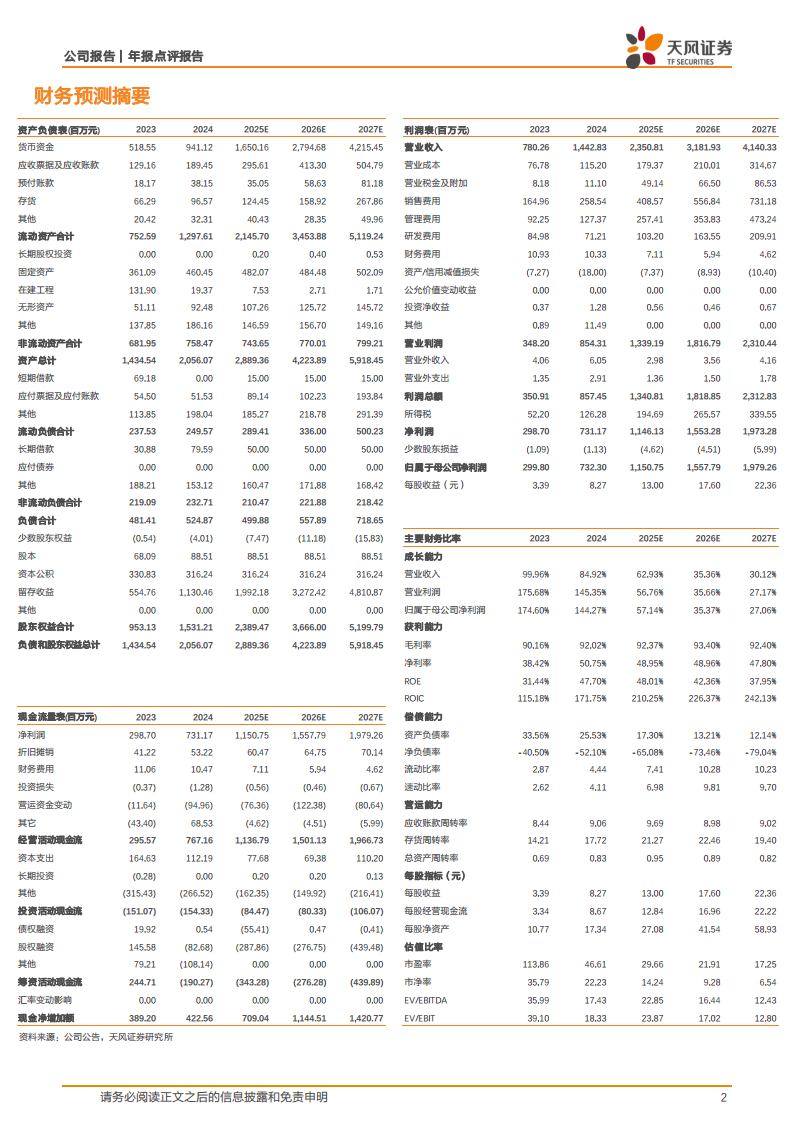 考虑到公司研发驱动的产品矩阵完善、国际化进展显著以及股权激励计划的推动,预计公司2025-2027年营收将分别达到23.51亿元、31.82亿元和41.40亿元;归母净利润将分别达到11.51亿元、15.58亿元和19.79亿元。对应PE分别为30x、22x和17x。分析师维持“买入”评级,目标价494元,对应2025年38倍PE。