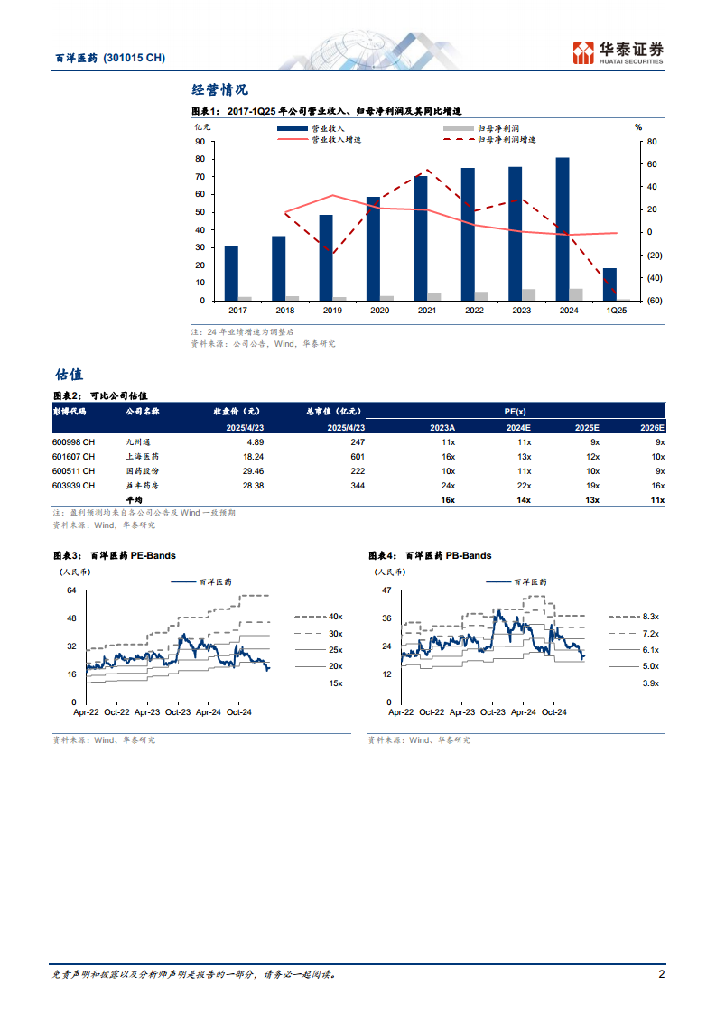 华泰研究维持对百洋医药的“买入”评级。尽管1Q25净利润短期受计提存货跌价准备以及销售费用率持续提高影响,但公司长期业务合作稳定。根据业绩情况,华泰研究上调了品牌代理业务收入增速预期,并上调了销售费用率预期。