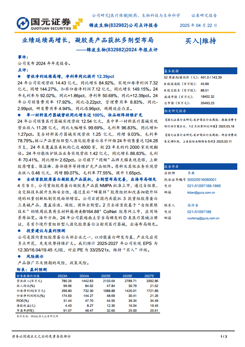 国元证券维持对锦波生物的“买入”评级。公司作为国内重组胶原蛋白领域的头部企业之一,以功能蛋白研发为基础,产业化应用多点开花,先发优势持续扩大。预计公司2025年至2027年每股收益(EPS)分别为12.30元、16.04元和19.45元,对应市盈率(PE)分别为33倍、25倍和21倍。