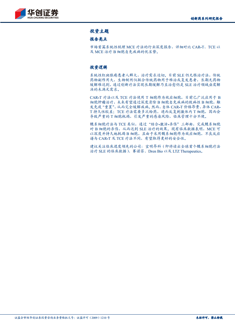 鉴于MCE疗法在安全性、有效性和可及性方面的潜在优势,本报告建议密切关注该领域的领先公司。宜明昂科的IMM0306作为全球首个自免巨噬细胞疗法,其治疗SLE的临床数据即将读出,并已在狼疮肾炎等适应症上展现潜力。赛诺菲通过收购Dren Bio的MCE药物DR-0201,已在风湿疾病领域展开临床试验。LTZ Therapeutics也凭借其MCE平台和融资进展,成为值得关注的参与者。