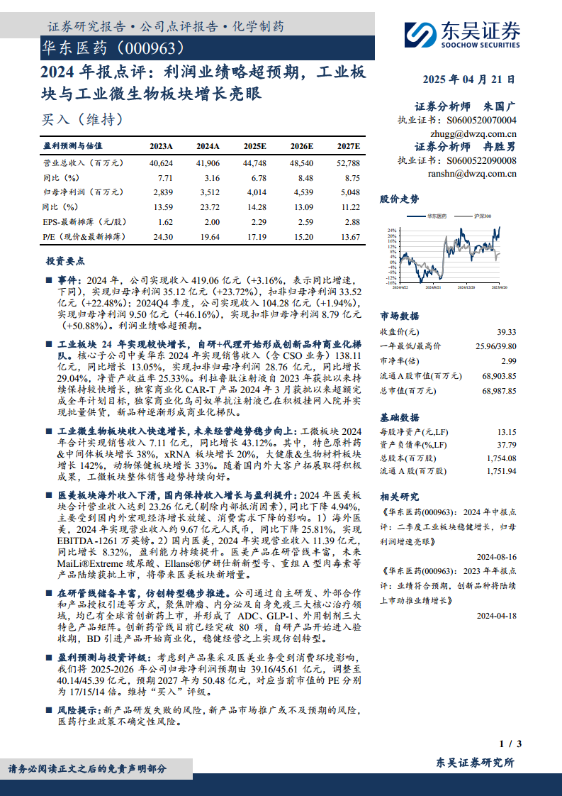 华东医药(000963):2024年报点评:利润业绩略超预期,工业板块与工业微生物板块增长亮眼