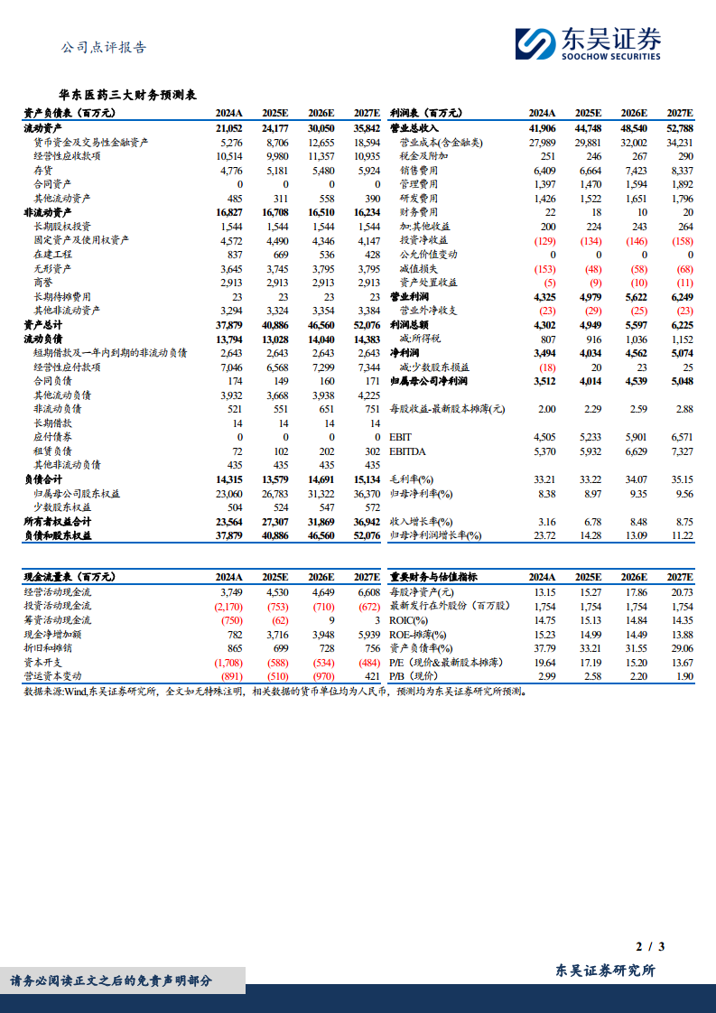 考虑到产品集采及医美业务受到消费环境影响,分析师将2025-2026年公司归母净利润预期由39.16/45.61亿元调整至40.14/45.39亿元,并新增2027年预期为50.48亿元。对应当前市值的PE分别为17/15/14倍。分析师维持对华东医药的“买入”评级。