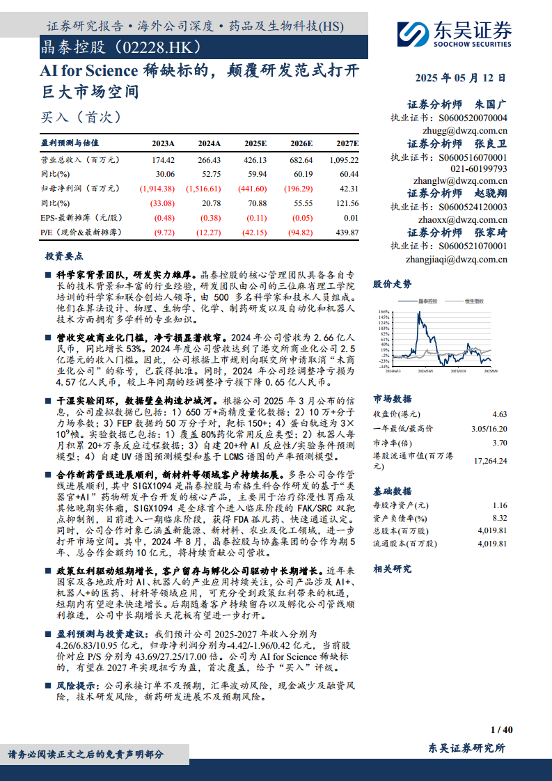 晶泰控股凭借其独特的AI for Science研发平台,融合量子物理、人工智能和机器人自动化技术,构建了“干湿闭环”的研发新范式。公司在药物研发领域展现出显著的降本增效能力,并成功将技术赋能拓展至新材料、新能源、农业等多个高增长行业。2024年营收突破商业化门槛,净亏损显著收窄,财务状况稳健。在政策红利、高客户留存率和孵化公司管线顺利推进的共同驱动下,晶泰控股的业绩增长具备较高确定性,有望在2027年实现扭亏为盈,具备巨大的市场潜力和投资价值。然而,公司仍面临订单不及预期、汇率波动、融资风险、技术研发风险及新药研发进展不及预期等潜在风险。