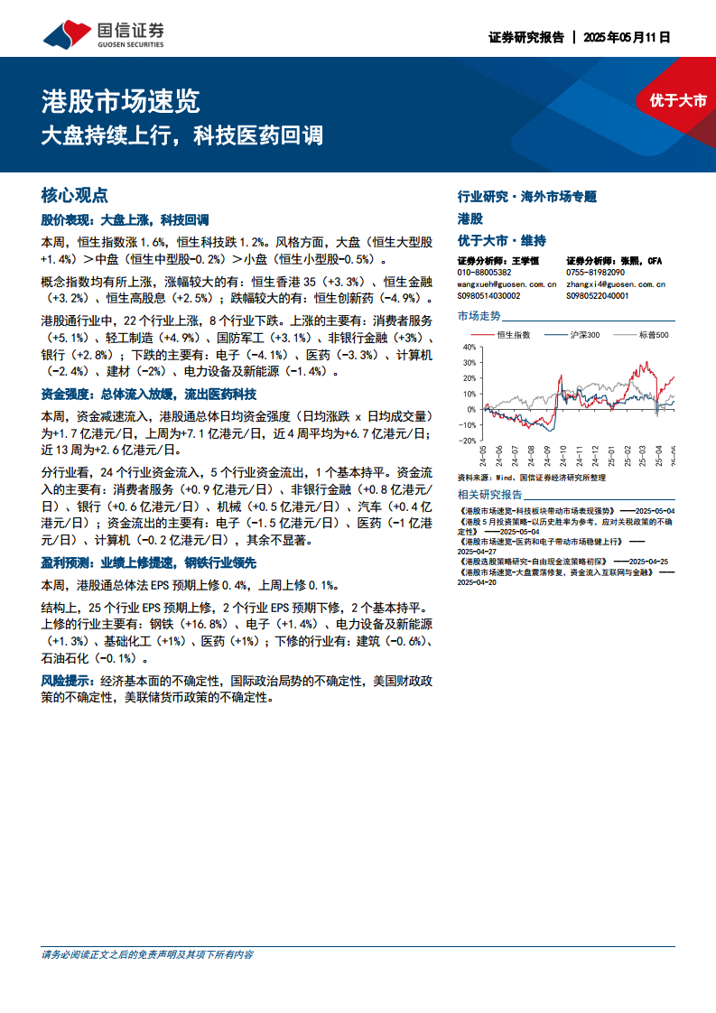 本周港股市场呈现大盘上涨与结构性分化的特征。恒生指数整体上行,但科技和医药板块出现回调。资金流向显示,市场资金从科技和医药板块流出,转而流入消费者服务、非银行金融和银行等传统价值板块。盈利预期方面,港股通总体EPS预期加速上修,其中钢铁行业表现尤为突出,而建筑和石油石化行业则面临下修压力。全球市场方面,A股普遍上涨,美股和部分欧洲市场承压。美债收益率上行,而中国国债收益率下行。投资者需关注经济基本面、国际政治局势、美国财政政策及美联储货币政策的不确定性带来的风险。