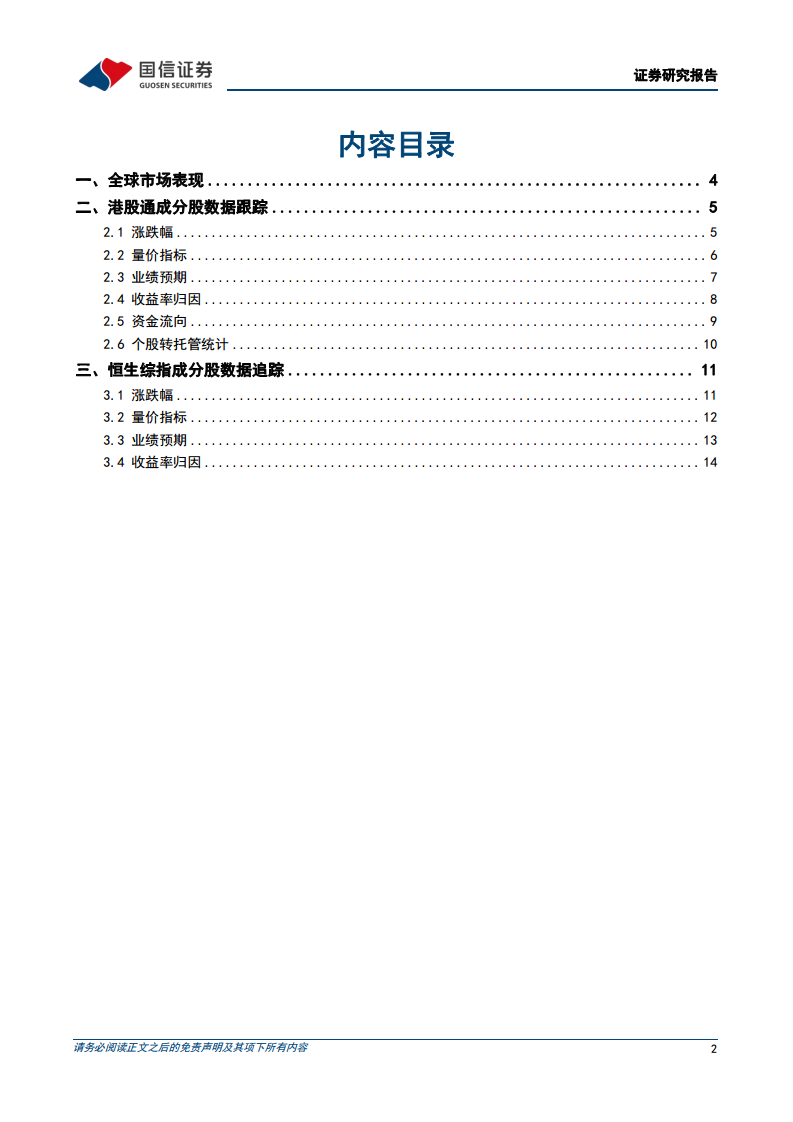 本周恒生综指板块收益率归因显示,金融-多元金融(+3.4%)、金融-银行(+2.6%)和可选消费-消费者服务Ⅱ(+2.4%)的总收益率表现较好。信息技术-半导体与半导体生产设备(-8.1%)、医疗保健-制药、生物科技与生命科学(-4.1%)和信息技术-技术硬件与设备(-3.1%)的总收益率表现较差。从EPS调整贡献来看,日常消费-食品与主要用品零售Ⅱ(+1.5%)、信息技术-技术硬件与设备(+1.5%)和可选消费-汽车与汽车零部件(+1.3%)贡献正面。从PE估值贡献来看,金融-多元金融(+3.2%)、金融-银行(+2.6%)和工业-运输(+2.4%)贡献正面,而信息技术-半导体与半导体生产设备(-7.3%)、医疗保健-制药、生物科技与生命科学(-5.1%)和信息技术-技术硬件与设备(-4.6%)的PE估值贡献为负。