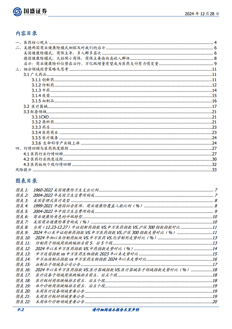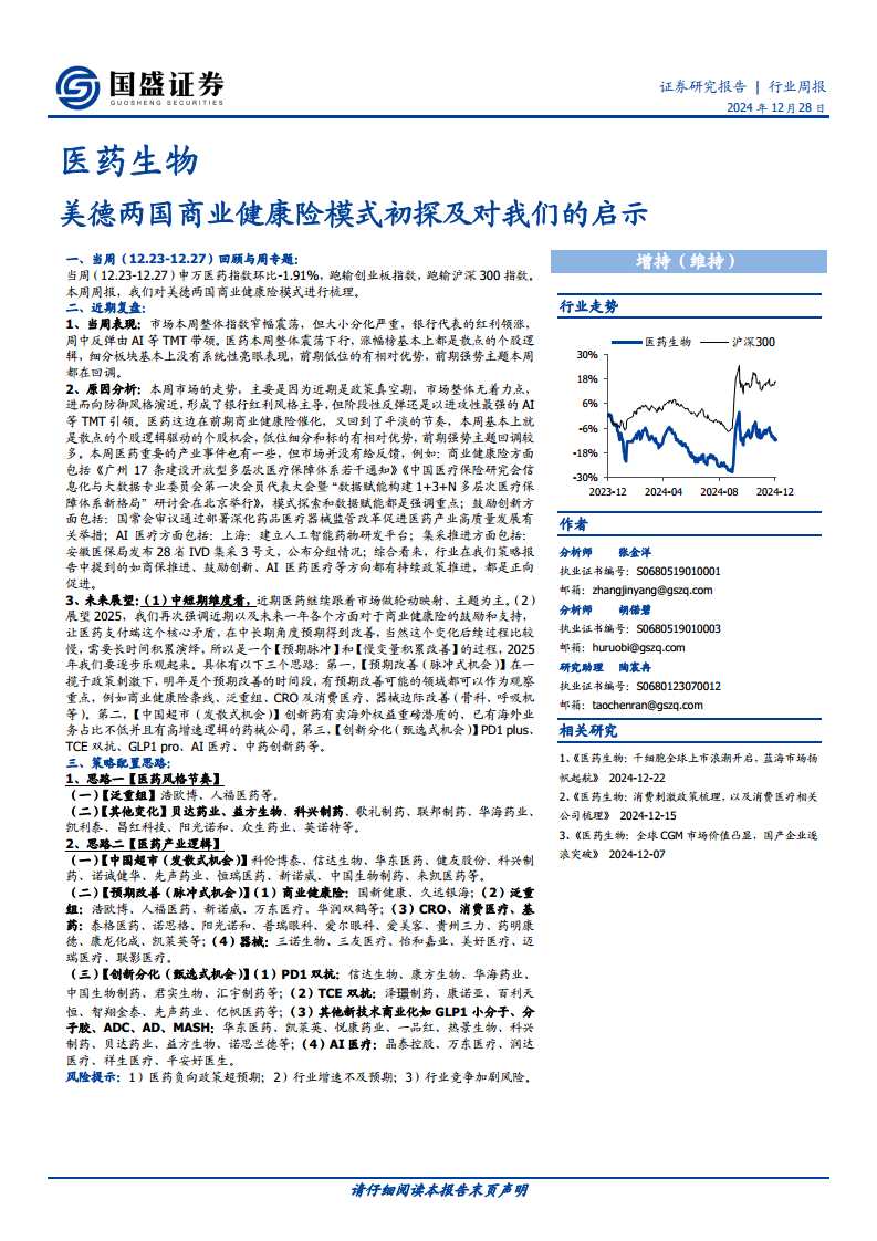 未来展望与策略配置思路 中短期维度看,医药板块将继续跟随市场进行轮动映射,以主题投资为主。展望2025年,报告再次强调商业健康险的鼓励和支持,认为其将作为“预期脉冲”和“慢变量积累改善”的过程,在中长期角度改善医药支付端的核心矛盾,对2025年医药市场持逐步乐观态度。 具体投资思路包括: