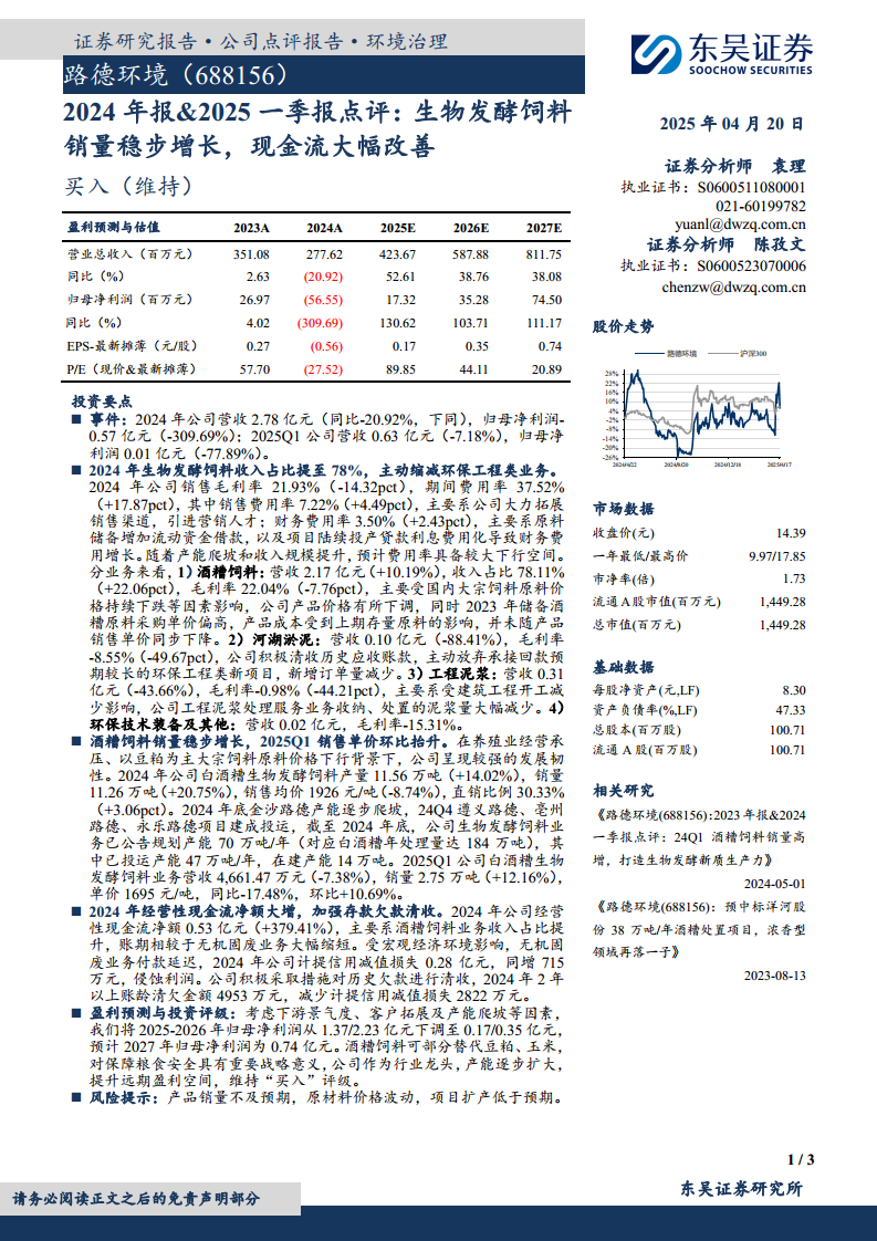 路德环境(688156):2024年报、2025一季报点评:生物发酵饲料销量稳步增长,现金流大幅改善