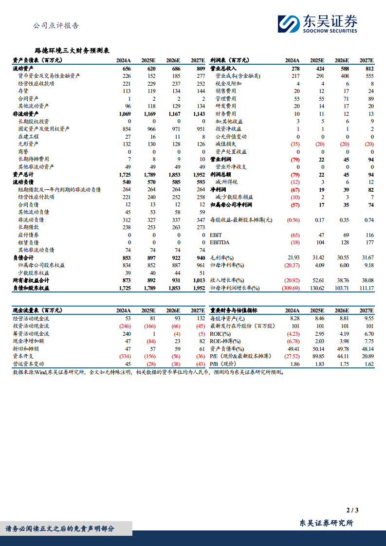 基于下游景气度、客户拓展及产能爬坡等因素,东吴证券将路德环境2025-2026年归母净利润预测分别下调至0.17亿元和0.35亿元(原预测为1.37亿元和2.23亿元),并预计2027年归母净利润为0.74亿元。报告强调,酒糟饲料作为豆粕、玉米的替代品,对保障粮食安全具有重要战略意义。公司作为行业龙头,随着产能逐步扩大,远期盈利空间将得到提升,因此维持“买入”评级。同时,报告提示了产品销量不及预期、原材料价格波动以及项目扩产低于预期等风险。