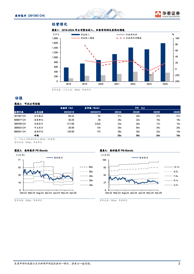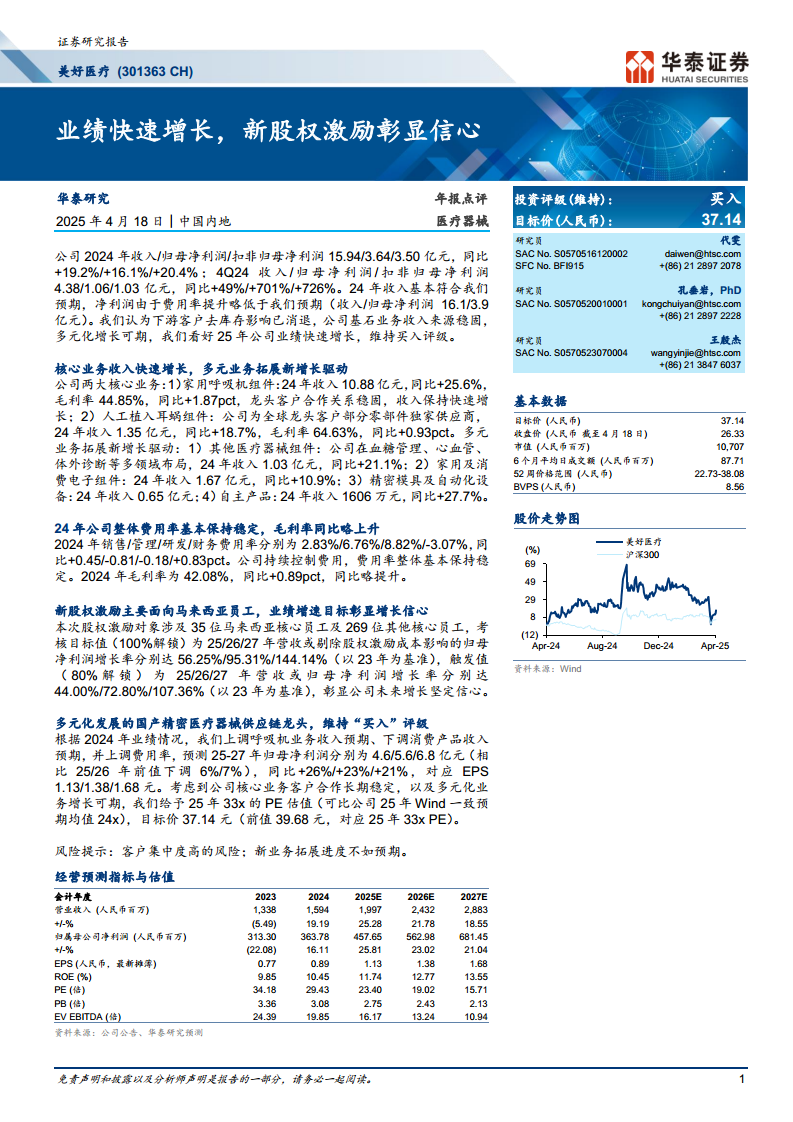 基于2024年业绩表现,华泰研究对美好医疗的盈利预测进行了调整,上调了呼吸机业务收入预期,下调了消费产品收入预期,并上调了费用率。预测2025年至2027年归母净利润分别为4.6亿元、5.6亿元和6.8亿元(其中2025年和2026年较前值下调6%和7%),同比增速分别为26%、23%和21%。对应每股收益(EPS)分别为1.13元、1.38元和1.68元。考虑到公司核心业务客户合作的长期稳定性以及多元化业务的增长潜力,华泰研究给予公司2025年33倍的市盈率(PE)估值(可比公司2025年Wind一致预期均值为24倍),目标价为37.14元人民币(前值为39.68元人民币)。华泰研究维持对美好医疗的“买入”评级。风险提示包括客户集中度高的风险以及新业务拓展进度不如预期的风险。