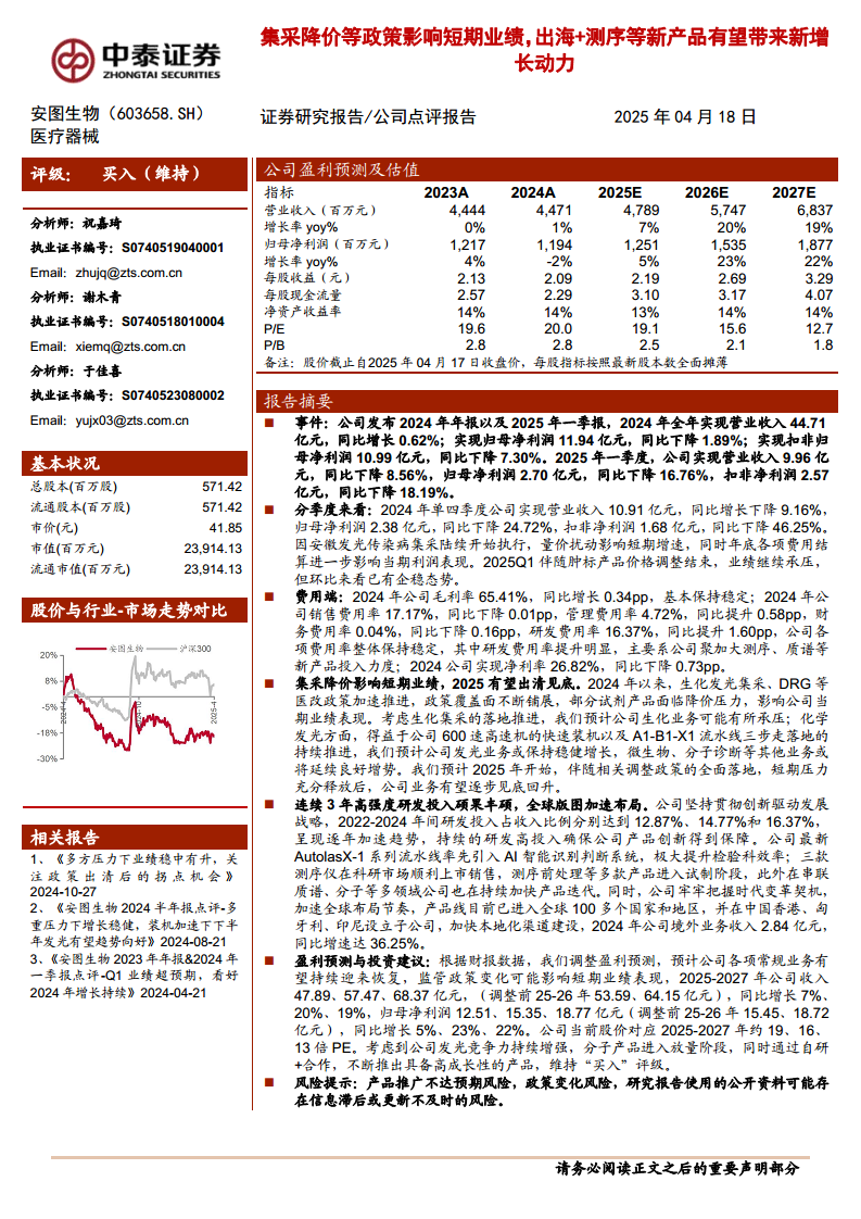 安图生物在2024年及2025年一季度面临集采降价等医改政策带来的短期业绩压力,表现为营收增速放缓及归母净利润下滑。然而,公司通过持续高强度研发投入,在新产品(如测序、质谱)方面取得显著进展,并积极拓展国际市场,海外业务实现高速增长,这些因素有望成为公司中长期业绩增长的新动能。
