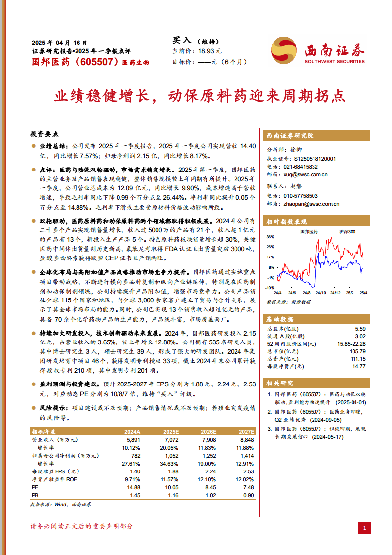 国邦医药在2025年一季度实现了营收和净利润的稳健增长,这主要得益于其医药与动保业务的“双轮驱动”战略。公司通过全球化市场布局、高附加值产品战略以及持续的研发投入,不断增强其核心竞争力和市场份额。尽管面临原材料价格波动等挑战,公司通过优化产品结构和技术创新,保持了良好的盈利能力。展望未来,公司有望继续保持增长态势,并维持“买入”评级,但投资者需关注潜在的项目建设、产品销售及养殖业疫情风险。