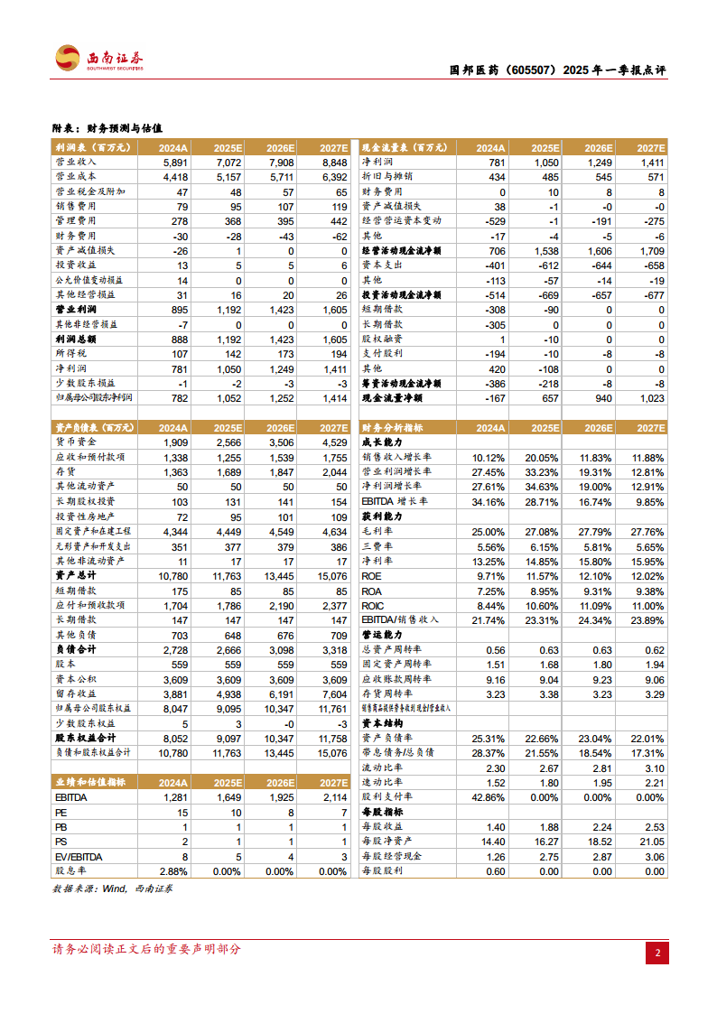 分析师预计国邦医药2025-2027年的每股收益(EPS)将分别为1.88元、2.24元和2.53元,对应动态市盈率(PE)分别为10倍、8倍和7倍。基于公司稳健的业绩增长、双轮驱动的业务模式、全球化布局以及持续的研发投入,分析师维持“买入”评级。同时,报告提示了项目建设或不及预期、产品销售情况或不及预期以及养殖业突发疫情等潜在风险。