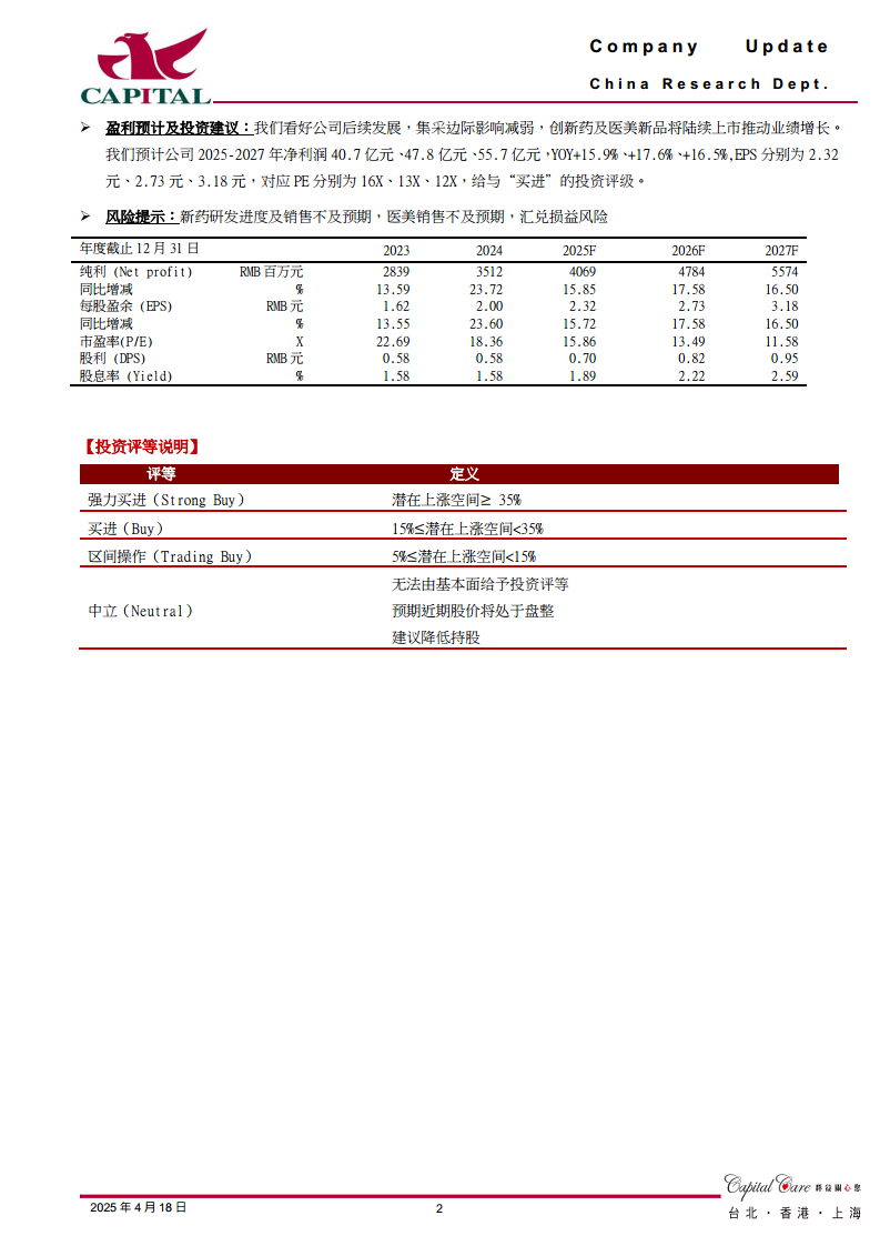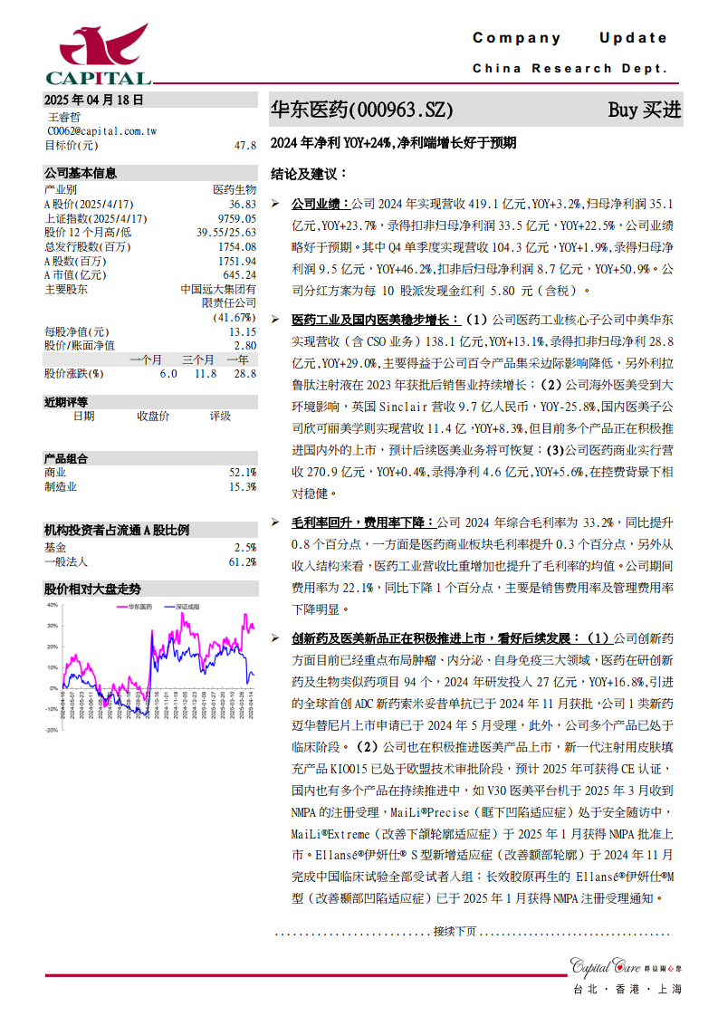 华东医药在2024年展现了强劲的业绩增长,归母净利润同比增长23.7%,超出市场预期。公司在医药工业和国内医美两大核心业务板块均实现了稳步发展,并通过优化财务结构,提升毛利率并有效控制费用。展望未来,公司持续高强度的研发投入和在创新药及医美新品方面的积极布局,将成为其业绩持续增长的关键驱动力。鉴于公司稳健的财务表现、清晰的增长战略以及丰富的产品管线,分析师给予“买进”的投资评级,并预计未来几年净利润将保持两位数增长。同时,报告也提示了新药研发及销售不及预期、医美销售不及预期以及汇兑损益等潜在风险。