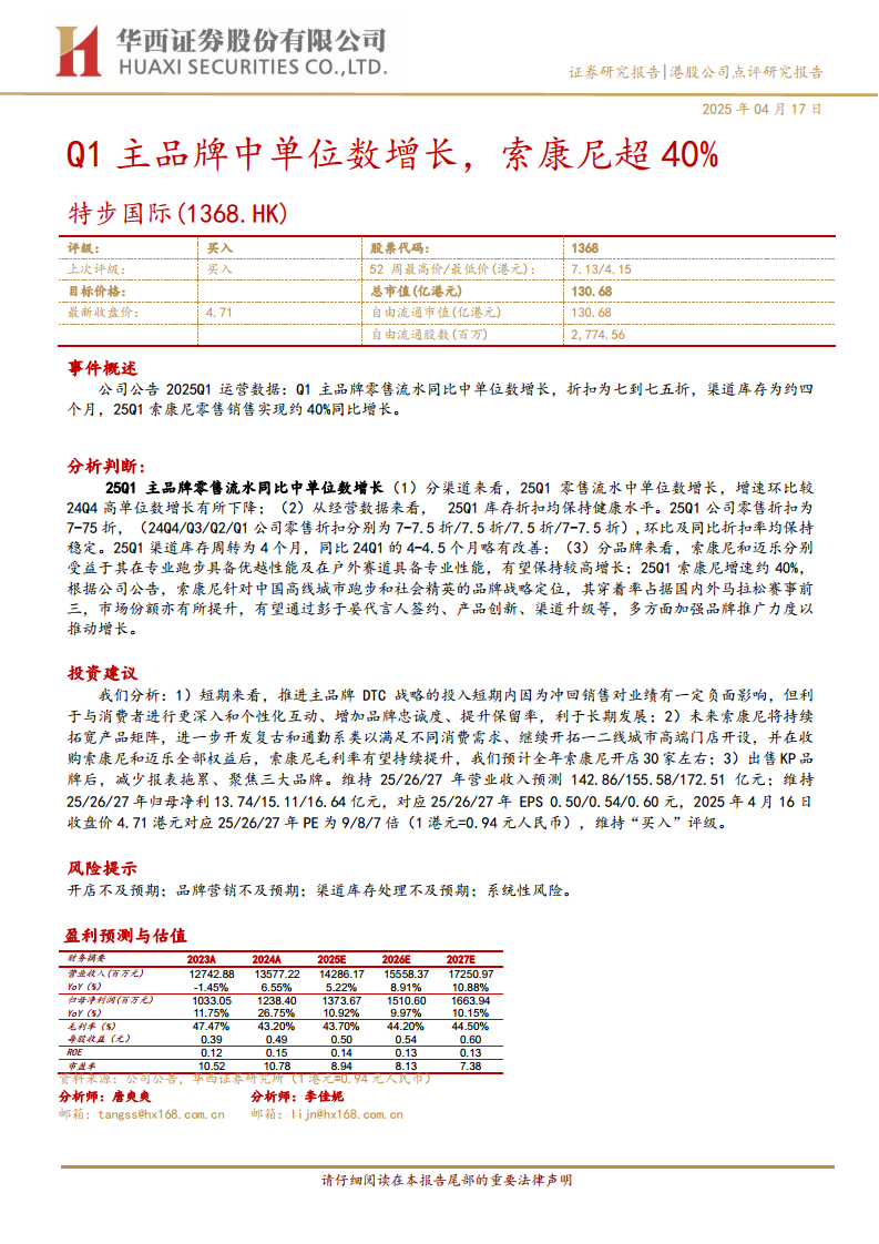 特步国际在2025年第一季度展现出稳健的运营态势,主品牌零售流水实现中单位数增长,同时库存和折扣水平保持健康。其中,索康尼品牌表现尤为突出,零售销售同比增长约40%,成为公司业绩增长的核心驱动力。公司通过聚焦高增长潜力品牌,并优化经营效率,持续巩固市场地位。