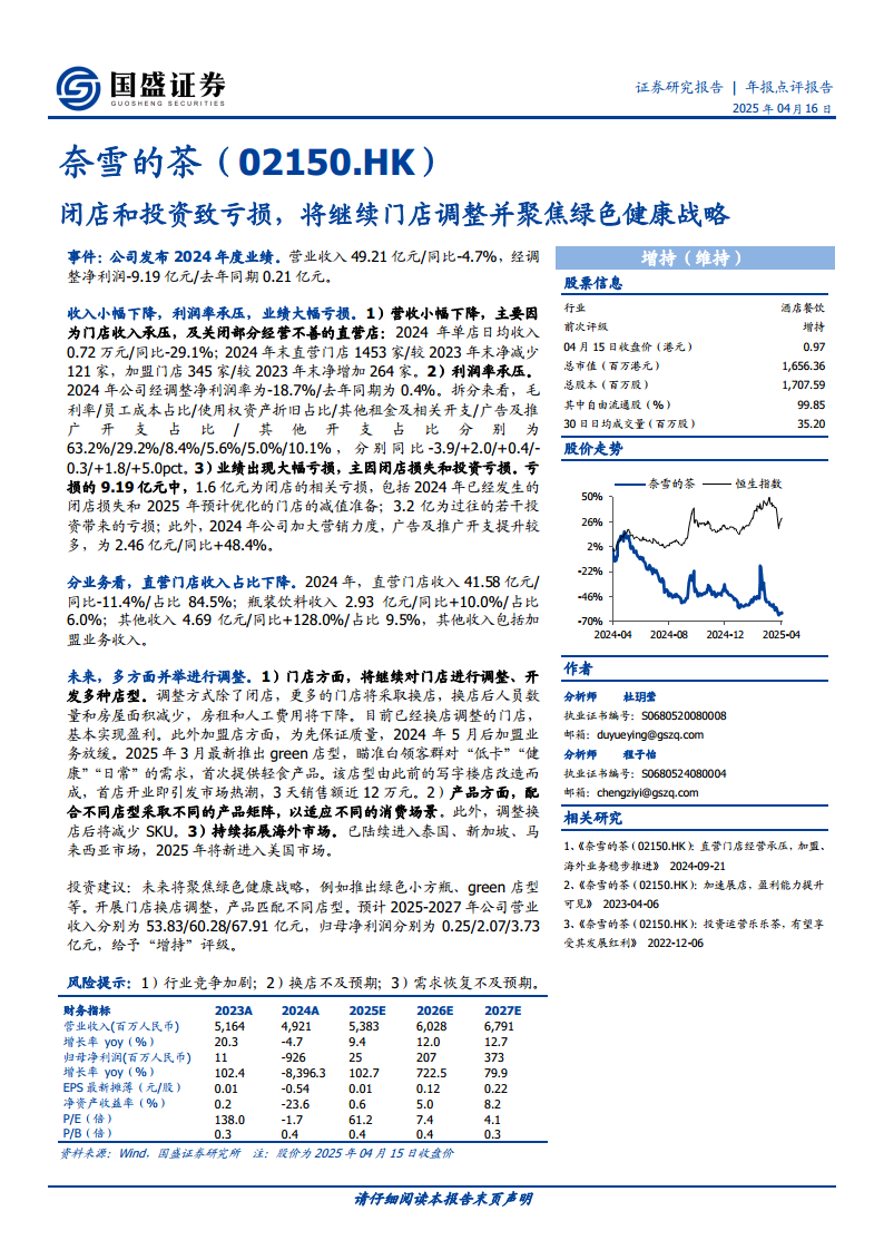 奈雪的茶未来将聚焦绿色健康战略,例如推出绿色小方瓶和“green”店型。产品方面,公司将配合不同店型采取不同的产品矩阵,并减少SKU。同时,公司将持续拓展海外市场,已进入泰国、新加坡、马来西亚,并计划于2025年进入美国市场。根据预测,公司2025-2027年营业收入将分别达到53.83亿元、60.28亿元和67.91亿元,归母净利润预计分别为0.25亿元、2.07亿元和3.73亿元。基于这些预期,报告维持“增持”评级。潜在风险包括行业竞争加剧、换店不及预期以及需求恢复不及预期。