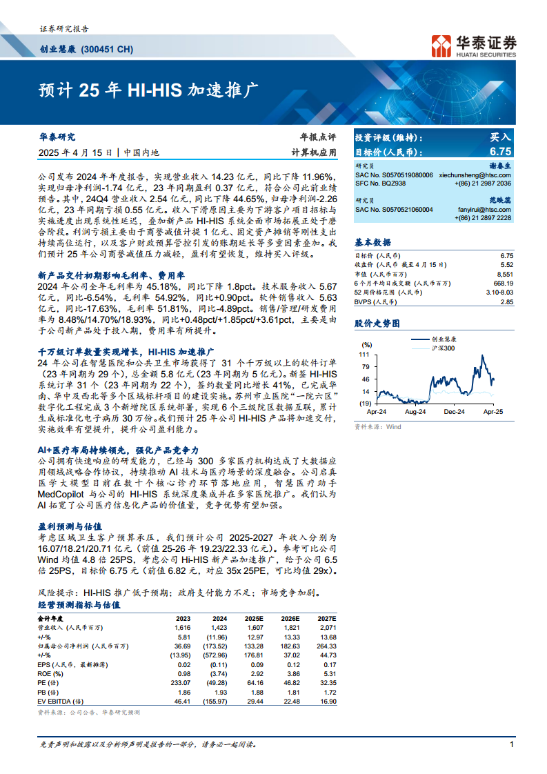创业慧康2024年业绩受多重因素影响出现下滑和亏损,主要原因包括项目实施延迟、新产品磨合期的投入以及商誉减值等。新产品交付初期也导致毛利率下降和费用率上升。然而,公司在新产品HI-HIS的推广上取得了积极进展,千万级订单数量和HI-HIS新签订单均实现增长,并在多个区域成功实施标杆项目。同时,公司在AI+医疗领域的持续投入和领先布局,有望提升产品价值和竞争力。华泰研究预计,随着2025年HI-HIS产品加速交付和实施效率提升,公司盈利有望恢复,并维持“买入”评级,目标价为6.75元人民币。投资者需关注HI-HIS推广进度、政府支付能力及市场竞争等风险。