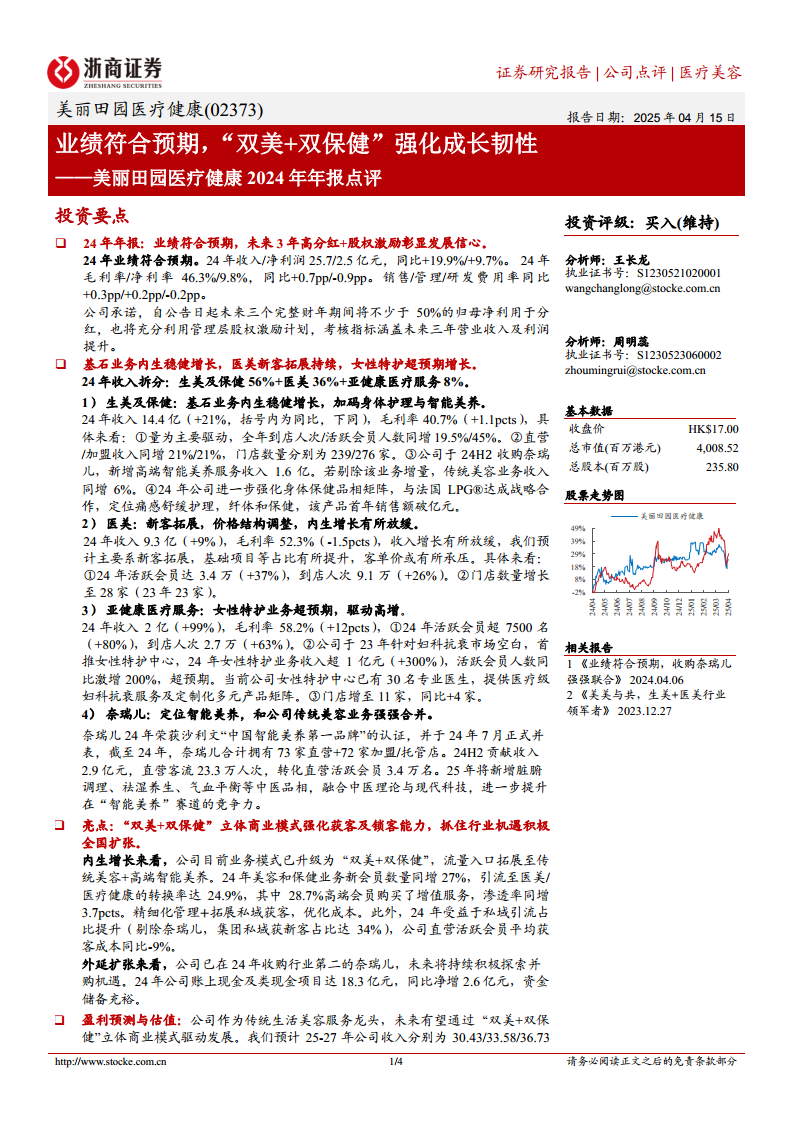 美丽田园医疗健康在2024年实现了稳健的业绩增长,收入和利润均符合市场预期。公司通过“双美+双保健”的立体商业模式,有效整合了传统美容、医疗美容和亚健康医疗服务,并成功拓展了智能美养领域。各业务板块表现良好,特别是女性特护业务实现超预期增长,奈瑞儿的收购也进一步增强了公司的市场竞争力。公司承诺高分红并实施股权激励,彰显了管理层对未来发展的信心。凭借充裕的资金储备和积极的扩张策略,美丽田园医疗健康有望在未来持续增长,其当前估值也具备吸引力,因此维持“买入”评级。