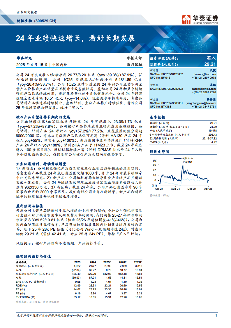 健帆生物在2024年实现了强劲的业绩增长,收入和归母净利润分别同比增长39.3%和87.9%。尽管2025年第一季度业绩因主动降价和高基数效应有所波动,但公司通过优化渠道库存和强化临床应用,保持了健康的经营状况。核心产品血液灌流器和血浆胆红素吸附器持续放量,肾科和肝科产品覆盖医院数量不断增加,成熟产品销量翻倍,新品渗透率快速提升,并有丰富的循证医学证据支持。同时,公司积极拓展急重症、心血管疾病等新场景,通过集采加速血液透析器和透析管路等新产品放量,并成功将产品覆盖至海外98个国家和地区的2000余家医院,构建了多元化的业务增长点。华泰研究基于对公司主营产品降价对收入和毛利率的影响,以及销售和研发投入增加对费用率的影响,调整了2025-2027年盈利预测,但仍维持“买入”评级,看好公司作为血液灌流行业领头羊的长期发展潜力。主要风险包括核心产品销售不达预期和产品招标降价。