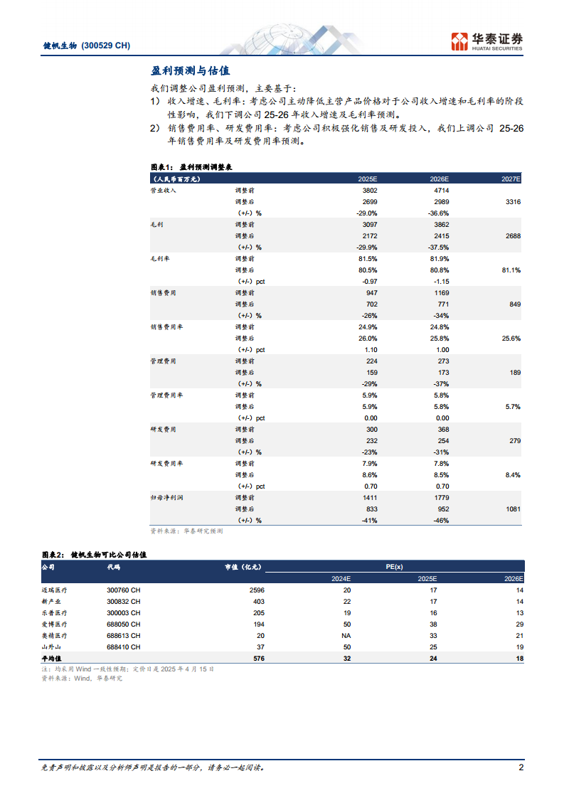 华泰研究调整了健帆生物2025-2027年归母净利润预测至8.33/9.52/10.81亿元(相比25/26年前值分别调整-41%/-46%)。调整原因主要包括: