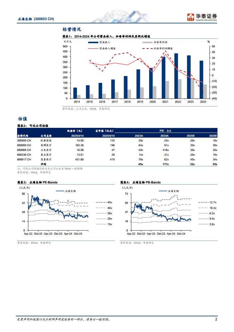 根据2024年业绩情况,华泰研究下调了口腔修复膜及骨修复材料等业务的收入增速及毛利率预期。预测公司2025-2027年归母净利润分别为1.51亿元、1.69亿元和1.88亿元,相比此前预测分别下调26%和28%。对应EPS分别为0.84元、0.94元和1.04元。基于2025年32倍PE估值(与可比公司2025年Wind一致预期均值32倍),目标价调整为26.87元(前值为30.50元,对应2025年27倍PE)。