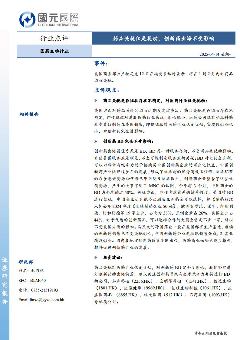 创新药的国际化发展,特别是通过BD模式,展现出强大的韧性和广阔的机遇,完全不受潜在药品关税的影响。