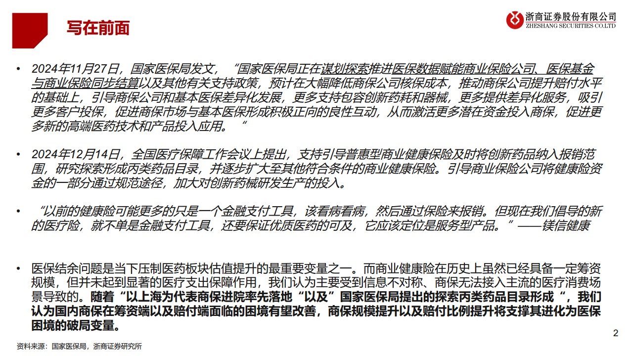 国内商保市场尽管在经历红利期后增速放缓,且在医疗支出中的占比和赔付比例仍有较大提升空间,但上海率先探索的商保进院直赔模式,以及国家医保局探索丙类药品目录的举措,正逐步打通商保发展的症结。惠民保的成功实践也证明了普惠型商保的巨大市场潜力。未来,商保将通过扩大带病体保障和满足高端医疗需求,实现进一步扩容。