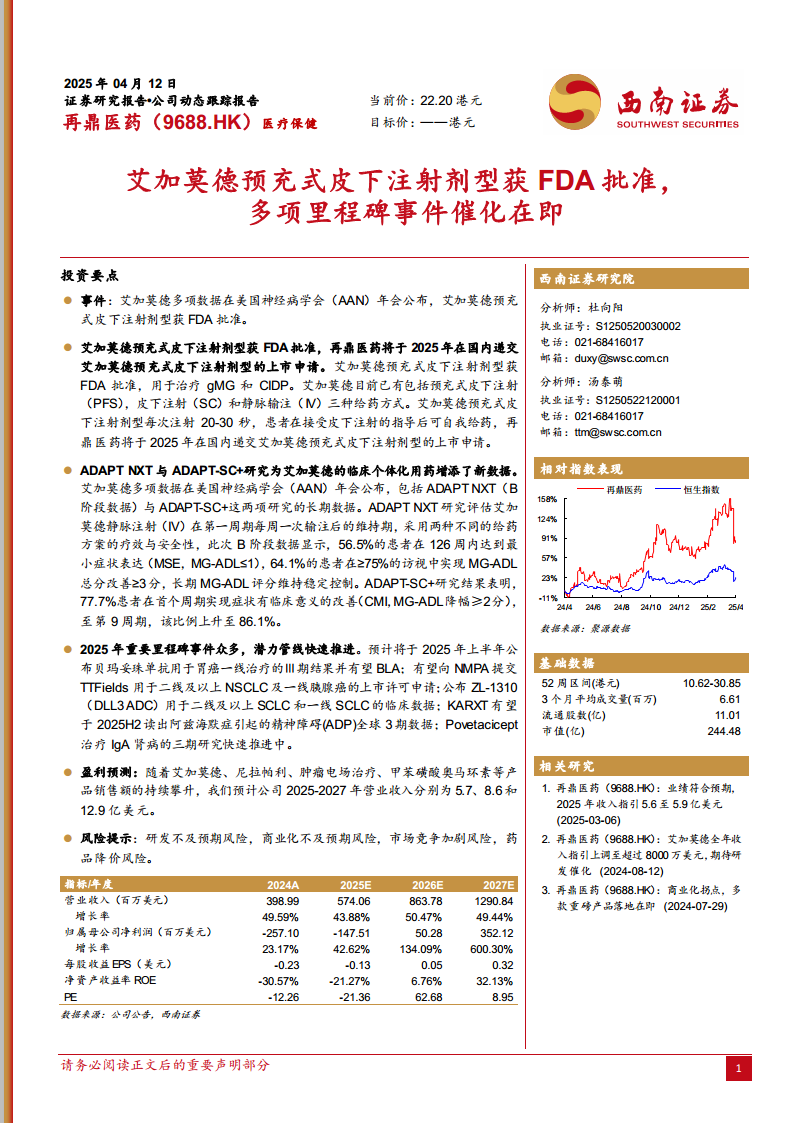 再鼎医药(09688):艾加莫德预充式皮下注射剂型获FDA批准,多项里程碑事件催化在即