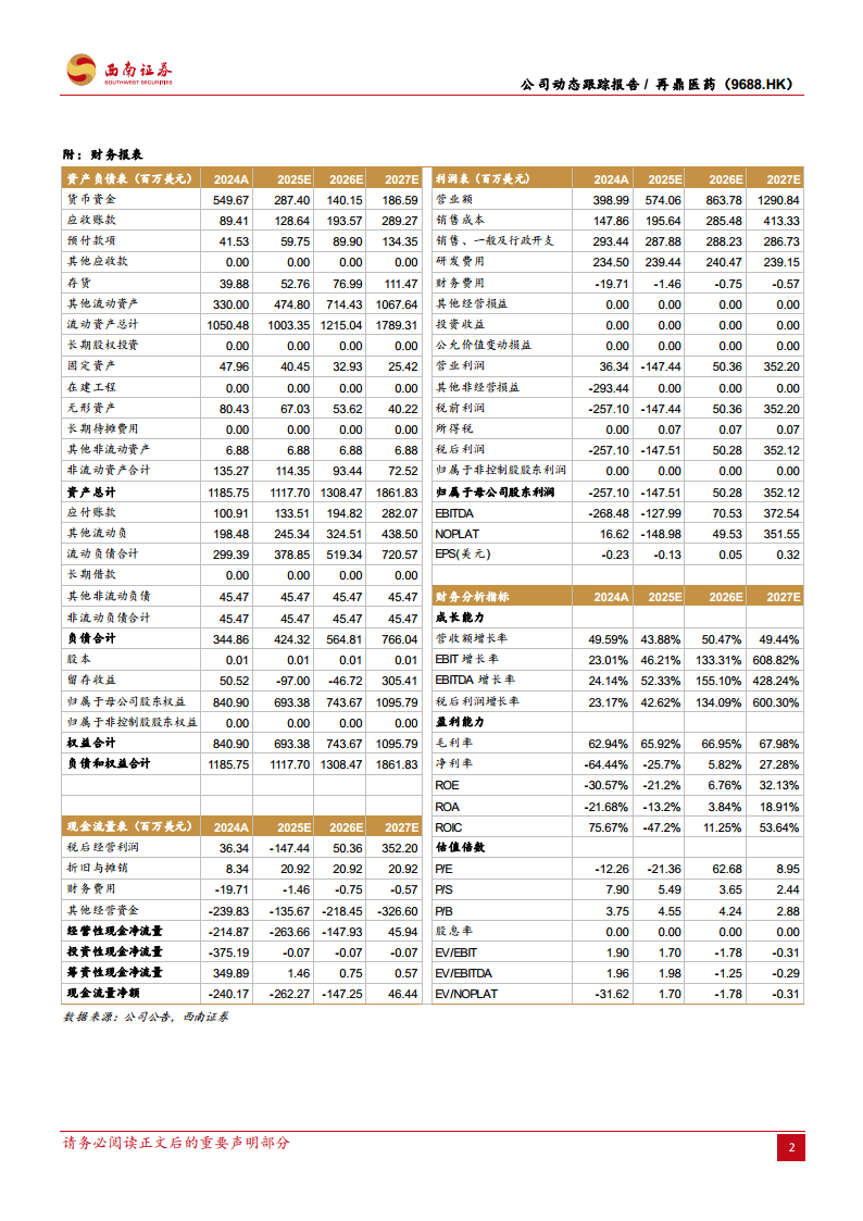随着艾加莫德、尼拉帕利、肿瘤电场治疗、甲苯磺酸奥马环素等核心产品销售额的持续攀升,再鼎医药预计 2025-2027 年营业收入将实现高速增长。具体预测数据显示,2025 年、2026 年和 2027 年的营业收入将分别达到 5.74 亿、8.64 亿和 12.91 亿美元,年增长率分别为 43.88%、50.47%和 49.44%。归属于母公司净利润预计在 2026 年实现扭亏为盈,达到 50.28 百万美元,并在 2027 年进一步增长至 352.12 百万美元。毛利率预计将从 2024 年的 62.94%稳步提升至 2027 年的 67.98%,显示出公司盈利能力的持续改善。