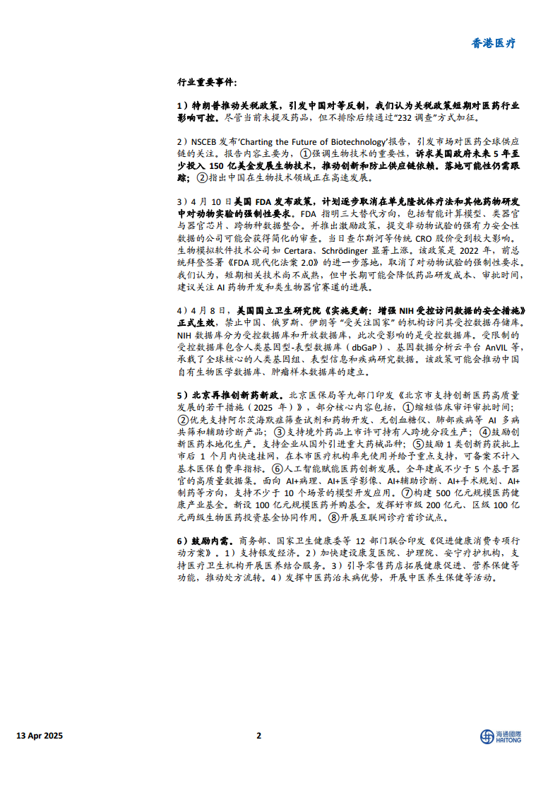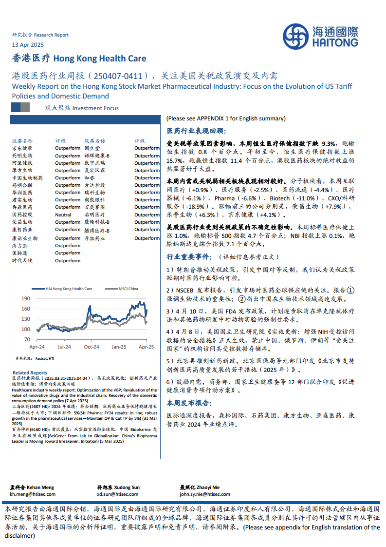 港股医药行业周报(250407-0411):关注美国关税政策演变及内需
