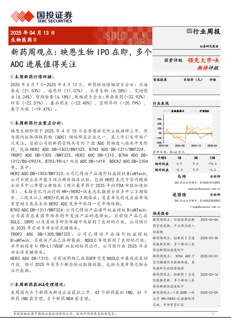 - 映恩生物IPO:公司将于2025年4月15日在香港联交所主板上市,作为国内ADC领域的明星企业,其上市引发市场广泛关注。