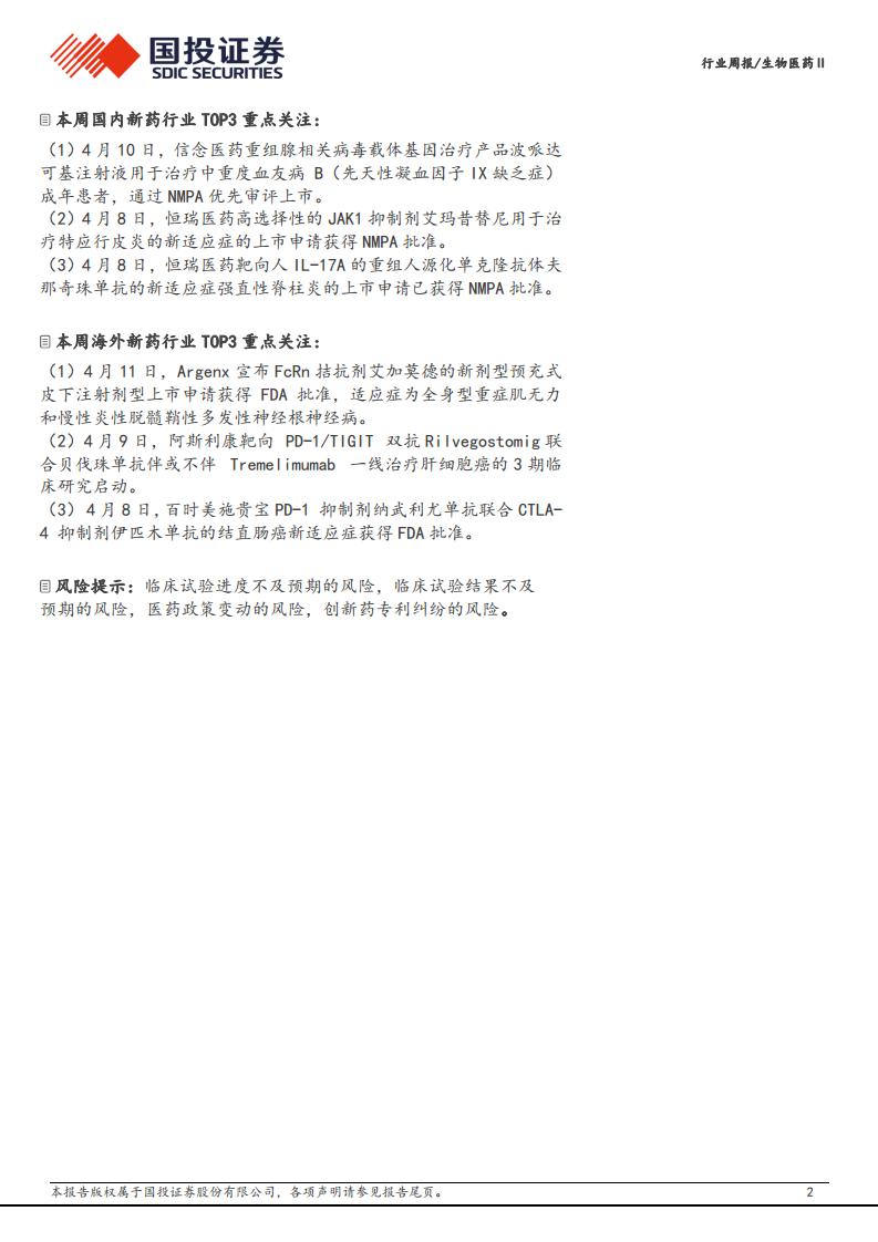 - 先声药业:4月9日,靶向FGFR2b的抗体偶联药物1类新药注射用SIM0686FGFR2b用于治疗阳性的局部晚期/转移性实体瘤获得CDE批准临床。