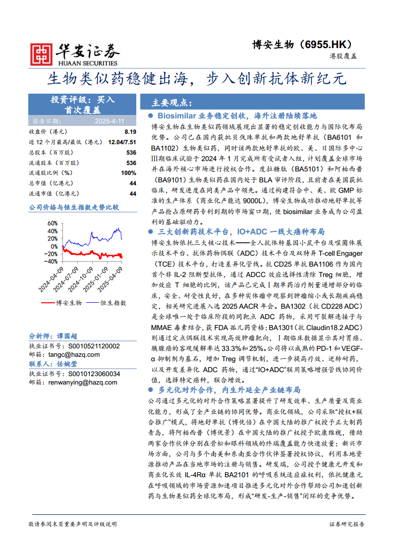 博安生物(6955.HK)凭借其“生物类似药+创新药”双轮驱动的战略,已在国内市场建立了稳固的商业化基础,并积极拓展全球市场。公司在贝伐珠单抗和地舒单抗等生物类似药领域取得了显著的销售业绩,并成功推动地舒单抗在欧美日等核心市场的国际多中心临床试验,为未来的全球化商业布局奠定基础。同时,博安生物依托其先进的抗体研发、ADC和TCE三大技术平台,构建了差异化的创新药管线,多款FIC药物在肿瘤免疫和ADC领域取得积极临床进展,展现出巨大的市场潜力。