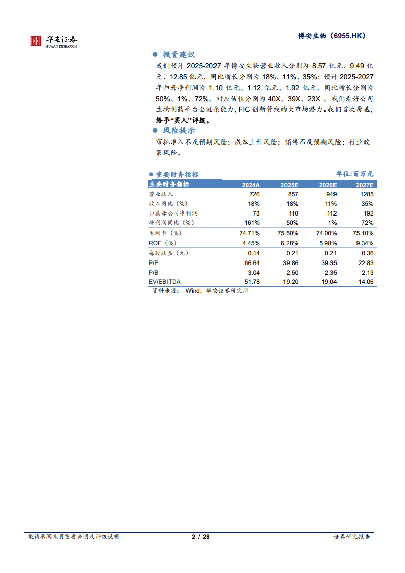 财务方面,公司在2024年实现扭亏为盈,营收和净利润均呈现稳健增长态势,预计未来几年将持续保持强劲增长。通过多元化的对外合作,博安生物有效整合了研发、生产和商业化资源,形成了全产业链的协同优势,加速了产品在全球范围内的市场渗透。综合来看,博安生物具备强大的研发创新能力、成熟的商业化体系和国际化的发展视野,其全链条生物制药平台和高潜力的创新管线使其在竞争激烈的生物医药市场中脱颖而出,具备显著的投资价值。