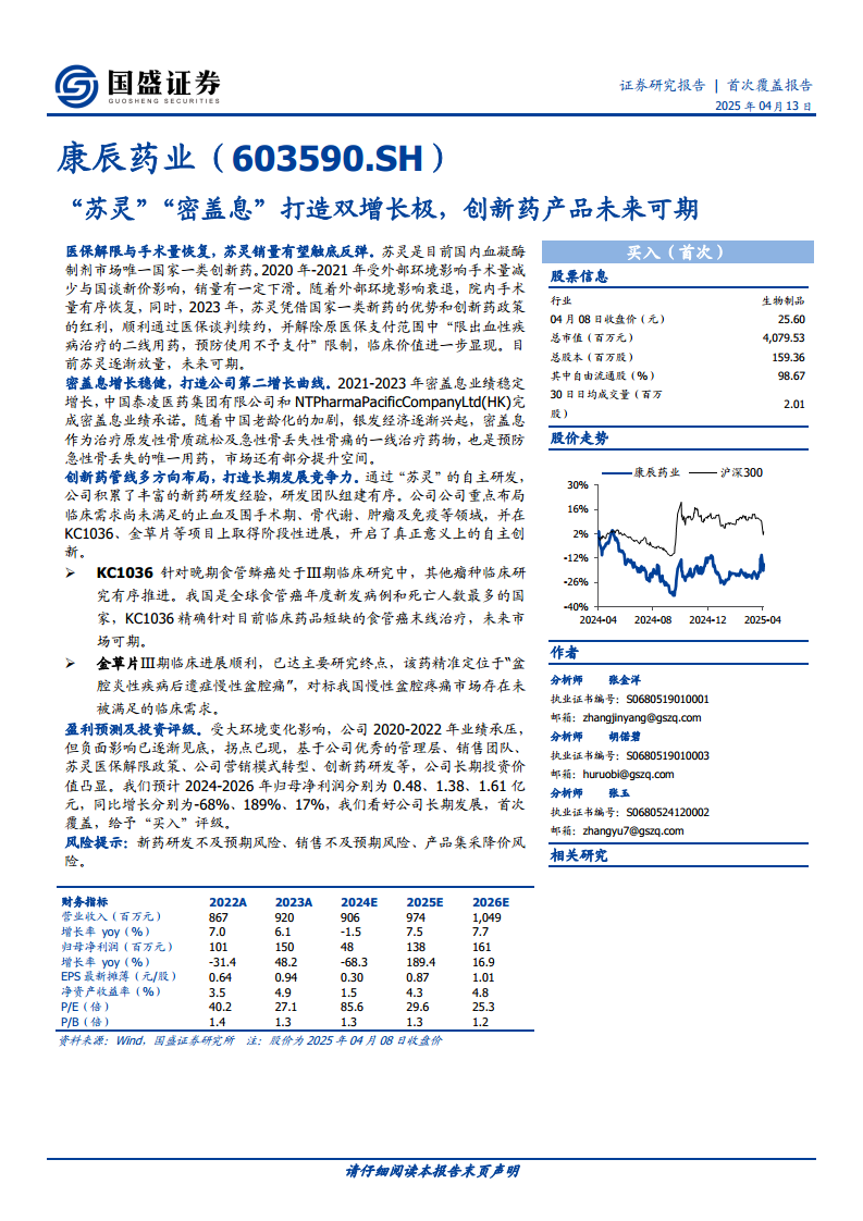 康辰药业(603590):“苏灵”“密盖息”打造双增长极,创新药产品未来可期