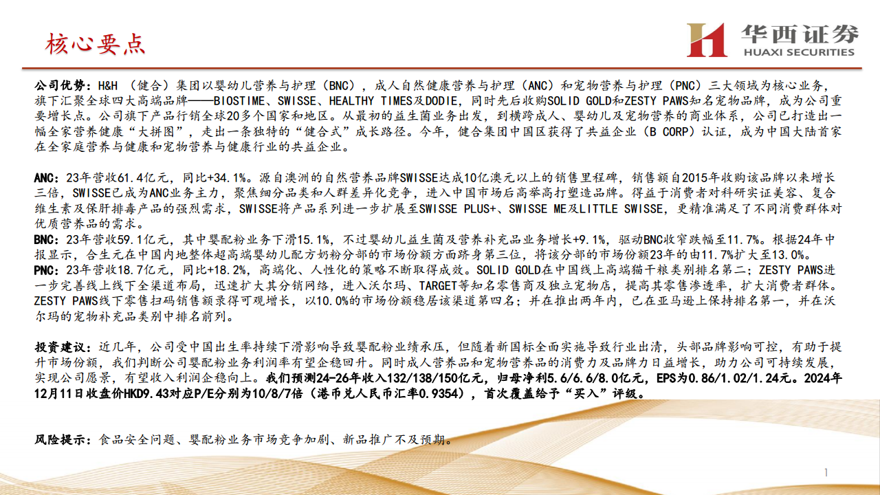 公司在产品创新、品牌建设和渠道拓展方面的持续投入,以及在财务管理上的优化(如经营现金流修复和去杠杆化),进一步夯实了其财务稳健性。展望未来,随着高利润营养补充品收入占比的提升和资本结构的持续改善,健合集团有望实现收入和利润的企稳向上。我们预测2024-2026年收入分别为132/138/150亿元,归母净利分别为5.6/6.6/8.0亿元,EPS为0.86/1.02/1.24元。基于当前估值和公司未来的增长潜力,首次覆盖给予“买入”评级。投资者需关注食品安全、婴配粉市场竞争加剧及新品推广不及预期等风险。