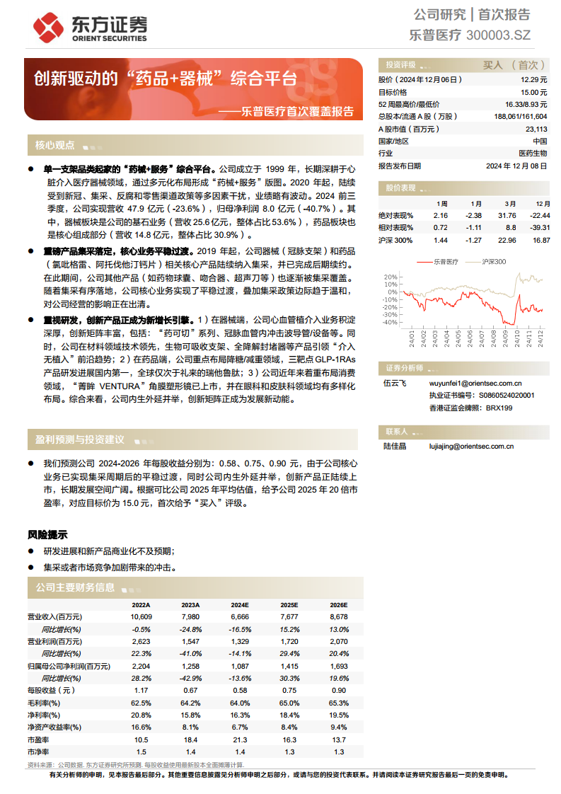 乐普医疗(300003)首次覆盖报告:创新驱动的“药品+器械”综合平台
