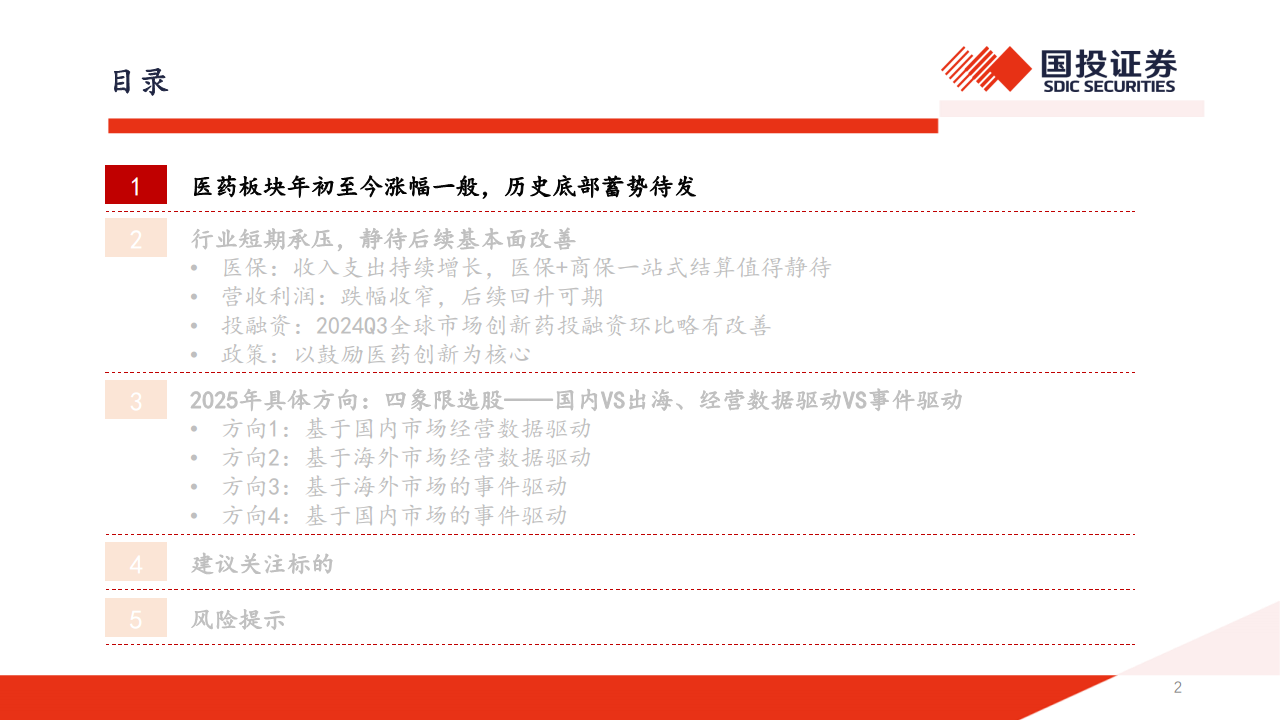 2025年医药行业的投资策略将聚焦“国内VS出海、经营数据驱动VS事件驱动”的四象限选股模型。该策略旨在捕捉新品种放量、仿创升级、医疗设备更新、血制品景气、CXO复苏等经营数据驱动的增长点,以及海外获批、BD合作、创新疗法突破、政策红利(如创新药鼓励应用目录、基药目录调整、国企改革、医保回款加速)和公共卫生事件等事件驱动的投资机会。