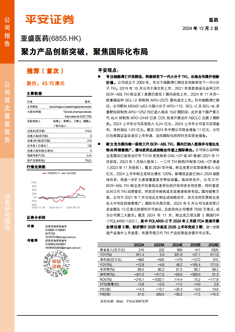 亚盛医药作为一家专注于细胞凋亡路径及下一代小分子酪氨酸激酶抑制剂(TKI)研发的创新型生物医药公司,其核心战略在于通过持续的产品创新解决未被满足的临床需求,并积极拓展国际市场。公司已成功实现首款商业化产品耐立克(奥雷巴替尼)在国内的上市并纳入医保,同时另一款重磅产品APG-2575(BCL-2抑制剂)也已在国内递交上市申请,有望成为全球第二款上市的同类产品。通过与信达生物在国内的销售合作以及与武田制药在海外的战略授权合作,亚盛医药正加速其核心产品的全球化布局,并于2024年上半年首次实现盈利,展现出强劲的发展势头和巨大的市场潜力。
